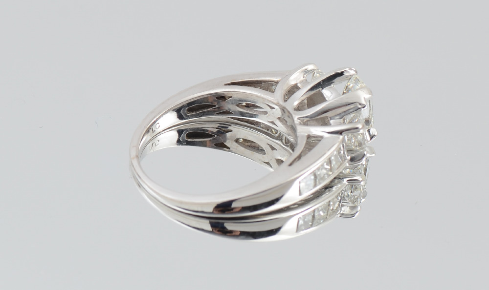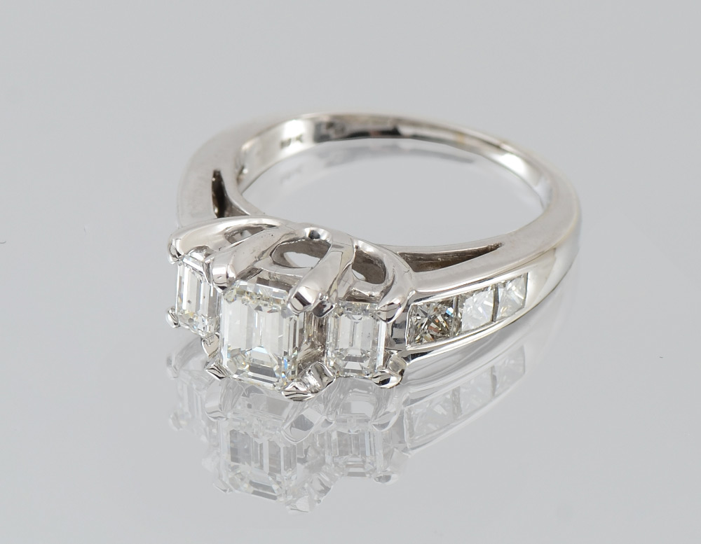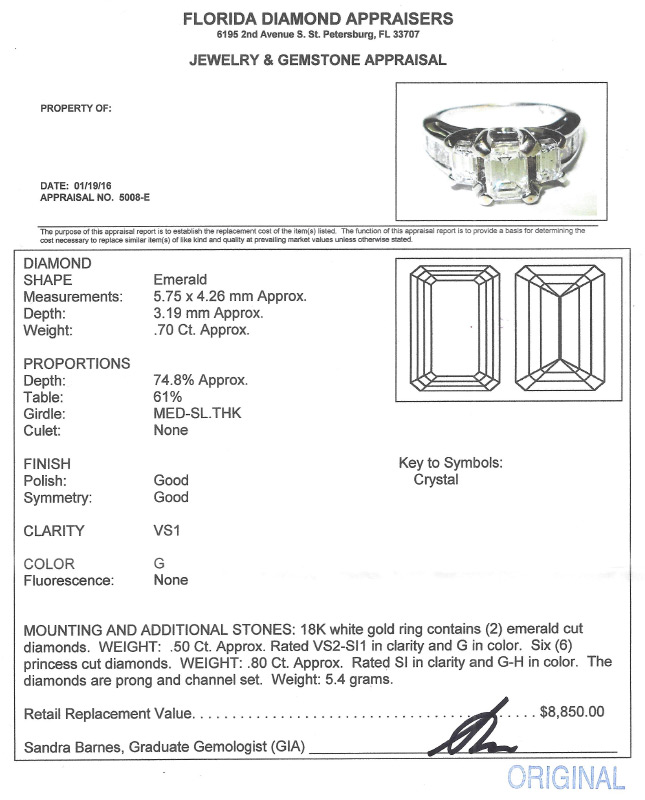2.O CTW DIAMOND ENGAGEMENT RING: 18K white gold ring featuring an emerald cut .70 Ct diamond of VS1 clarity and G color. The additional 2 emerald cut diamonds and 6 princess cut diamonds add another 1.30 Ct. Size 6. Weight 5.4 grams. Sold with current Florida Diamond Appraisers GIA graduates appraisal for $8,850.