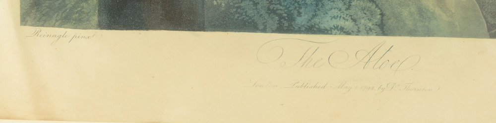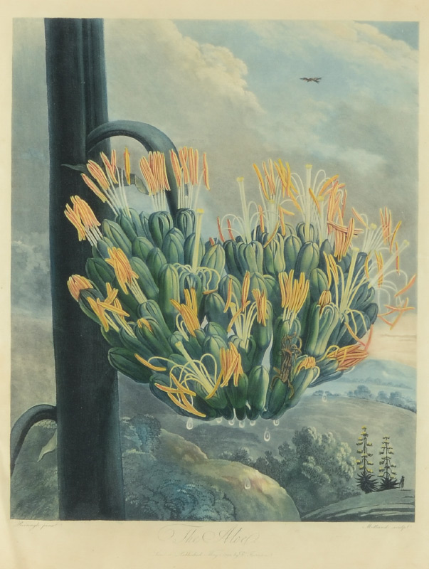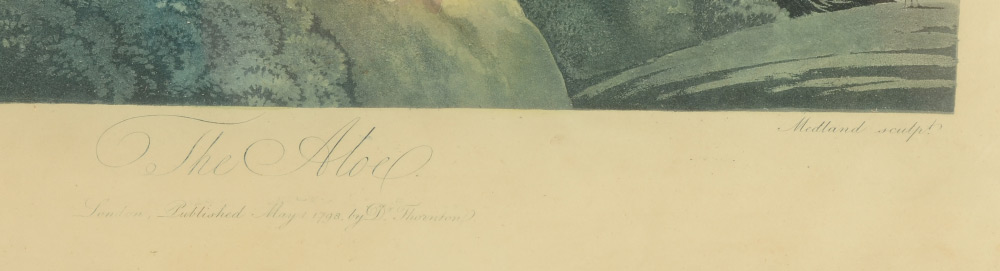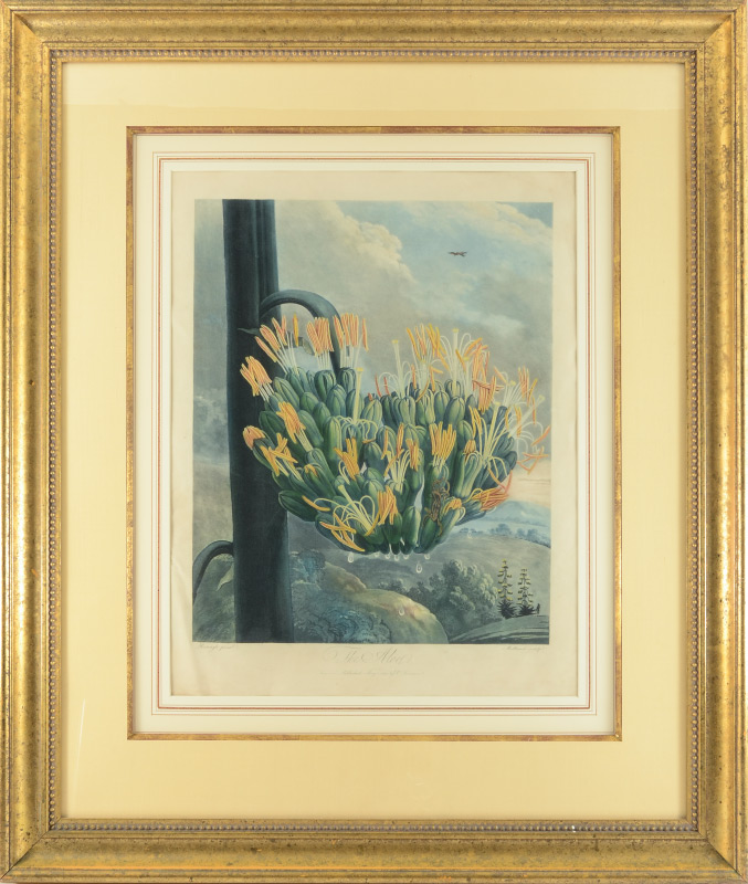 ''THE ALOE'' ENGRAVING: Engraving titled ''The Aloe'' for D. Thornton, sight size 20.5'' x 15.5'', custom frame, 34'' x 29.25'', label verso from the Donald Heald Fine Art Gallery NY, NY, for the Ritz Carlton Amelia Island.