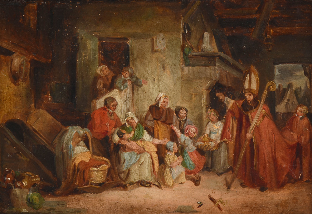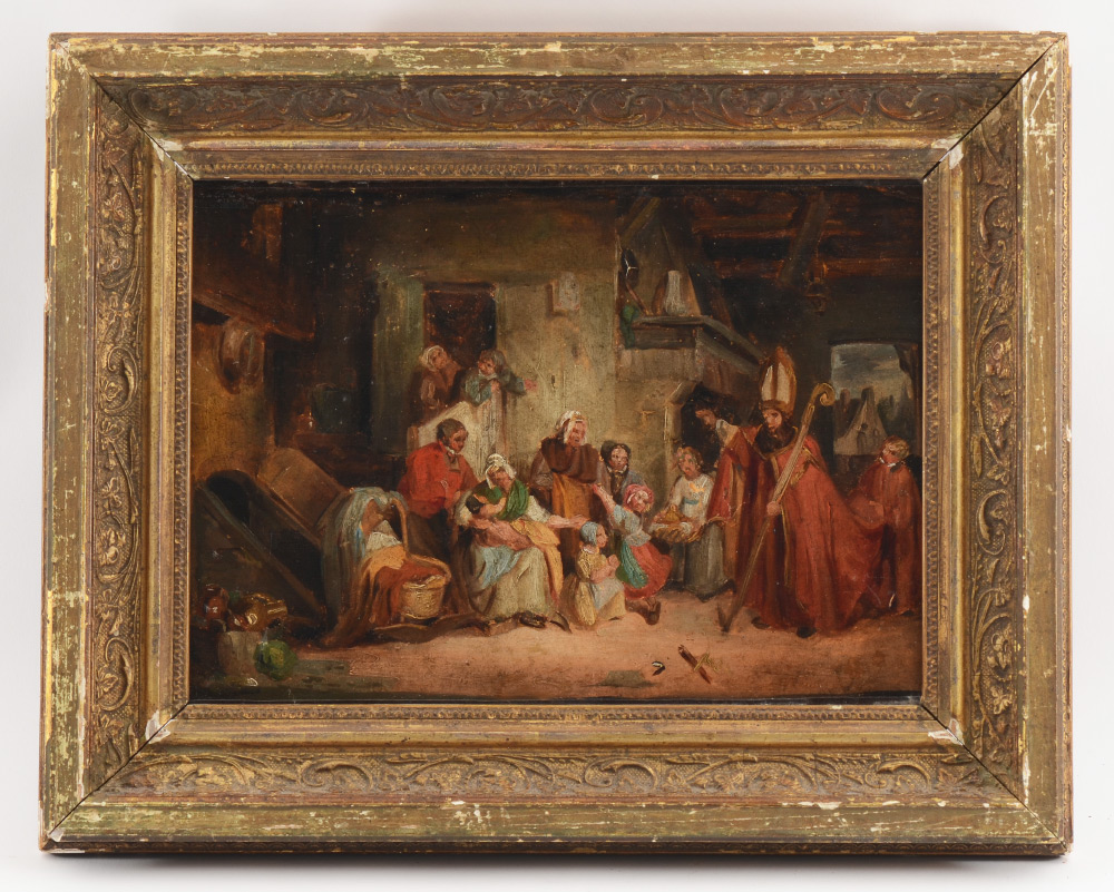 19TH CENTURY PAINTING OF BLESSING OF NEWBORN: No visible signature, Oil/Canvas, 7.5'' x 11.25'', no visible signature, period frame, 11.75'' x 14.5''.