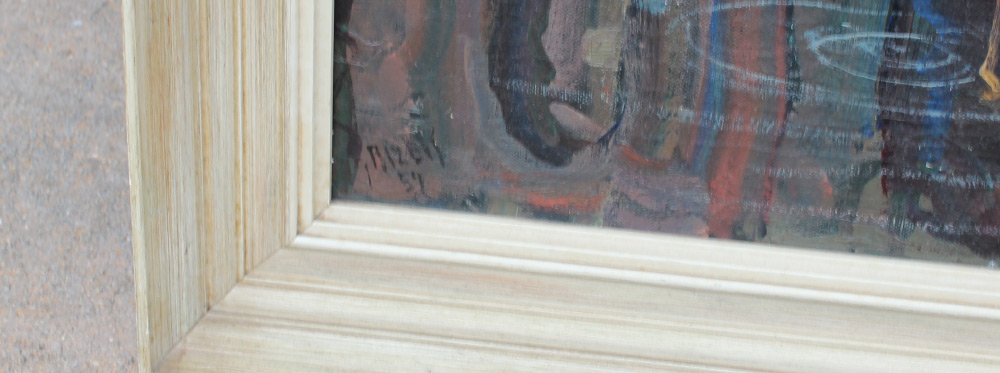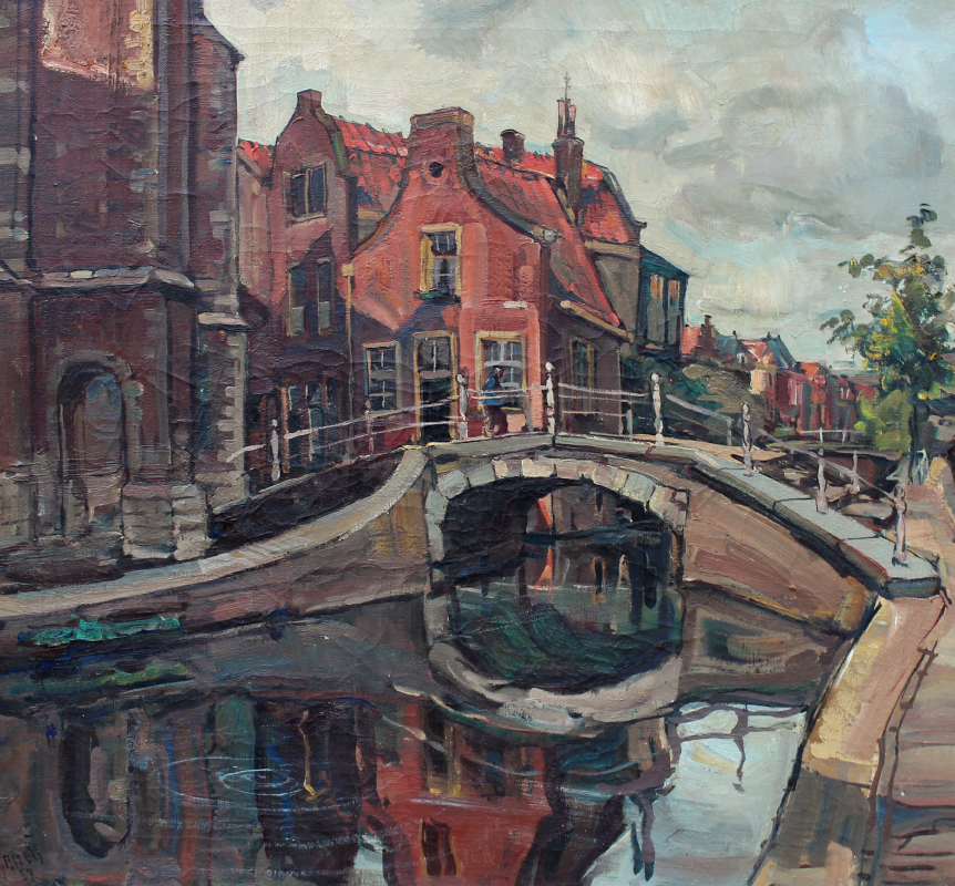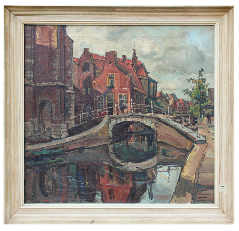 RIZEK, Emil, (Austrian, 1901-1988): Delft Canal Scene with Figures, Oil/Canvas 23 5/58'' x 25.75'', signed lower left, painted frame, 27.75'' x 29.75''. Christies label affixed to the frame lower right. Rizek was born to a father who wanted him to be an electrical engineer like himself. However, Rizek was interested in becoming an artist, took private lessons, traveled to Italy, France, Germany and Holland where he became recognized as part of the ''School of the Hague'' a group of Dutch Impressionists. As he traveled, teaching himself to paint, scenes of everyday work and life began to appear in his work. Rizek served in the Wehrmacht beginning in 1941 serving as a war artist and reporter, mainly in Finland. He was captured by the British army and spent months as a prisoner towards the end of the war. He was emotionally drained by his war time experiences, and found it challenging to return to painting.