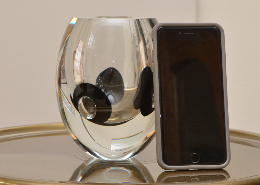 TIMO SARPANEVA FINNISH ART GLASS VASE: Ovoid form with control bubble in black decoration, signed on base Timo Sarpaneva 194/1985. Measures 6 1/2'' h. x 5''.