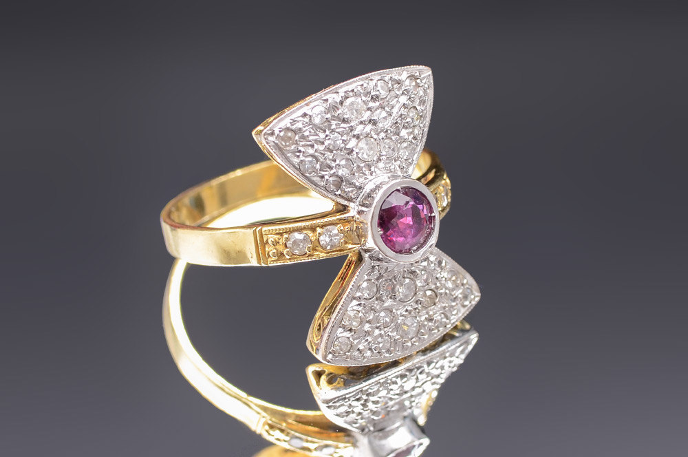 RUBY & DIAMOND RING: 14K yellow gold ring centering one round faceted ruby, approx. .50 Ct., Rated SI in clarity (Type II), stpR in Hue, 5 in Tone and 3 in Saturation. The 32 round full cut and single cut diamonds total approx. .65 Ct. Rated SI-I1 in clarity and H-I in color. The diamonds are pave' set. The ruby is knife set. Weight: 5.0 grams. Size: 8