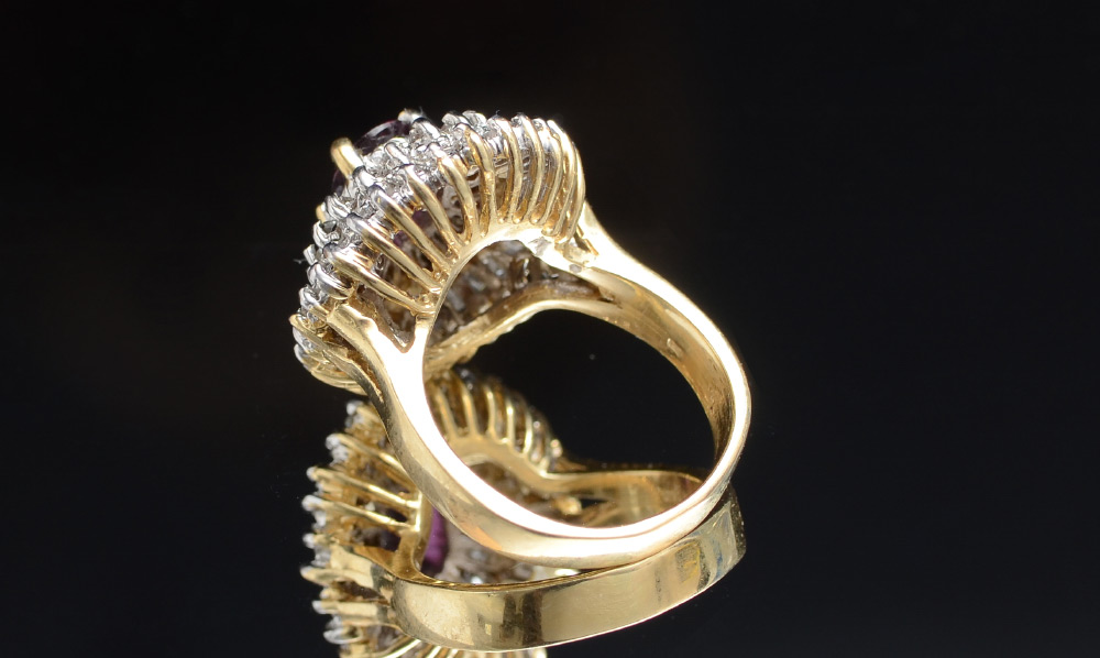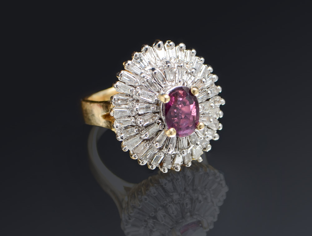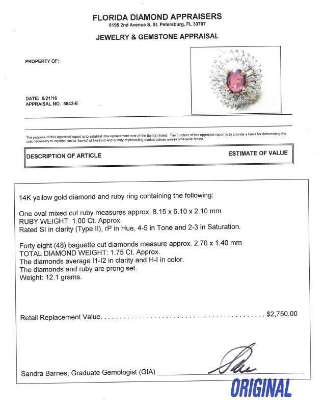RUBY AND DIAMOND RING: 14K yellow gold ring centering a 1.00 Ct oval mixed cut ruby framed by 2 tiers of 48 baguette cut diamonds totaling approx. 1.75 Ct., rated I1-!2 clarity and H-I color. Size 7. Weight 12.1 grams. Sold with current Florida Diamond Appraisers GIA graduates appraisal for $2,750.