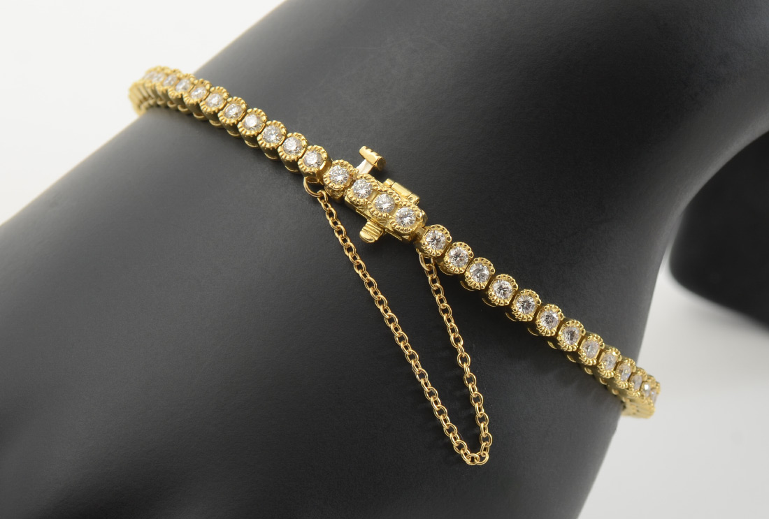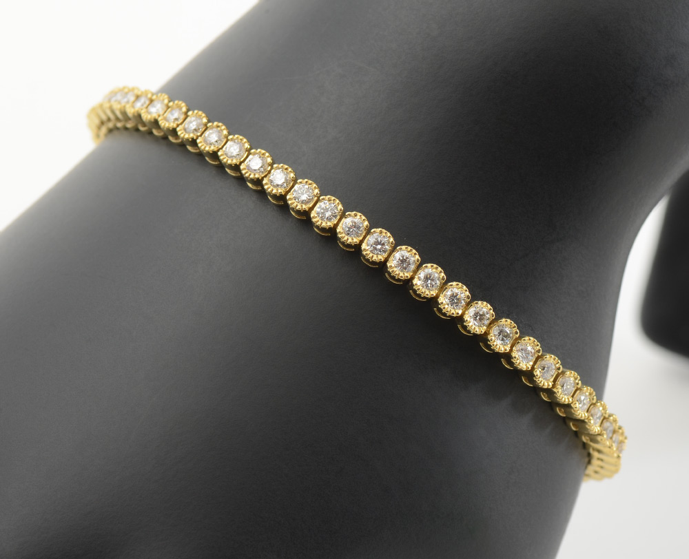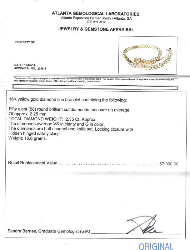 18K DIAMOND TENNIS BRACELET: 18K yellow gold line bracelet of 58 round brilliant diamonds totaling approx. 2.35 Ct., averaging VS clarity and G color. Length 7''. Weight 16.6 grams. Sold with 2014 Atlanta Gemological GIA graduate's appraisal for $7,000.