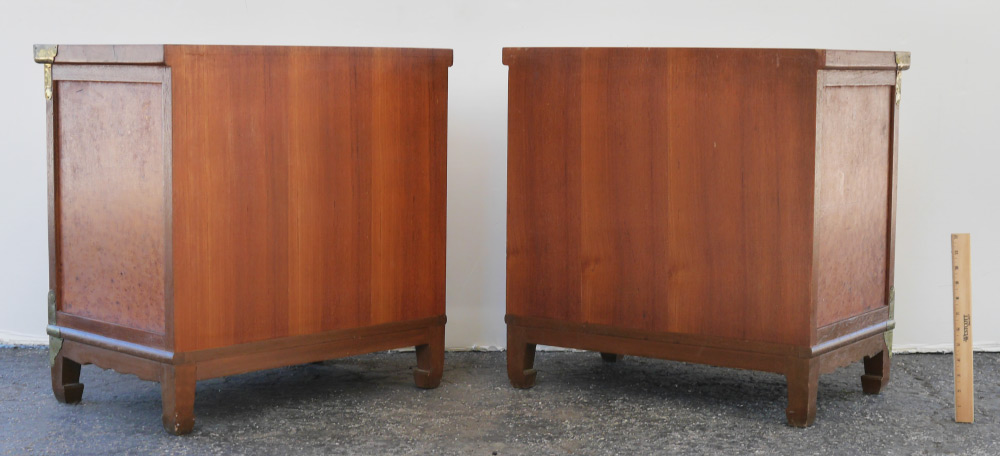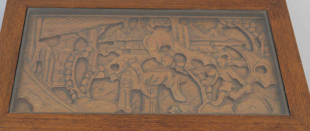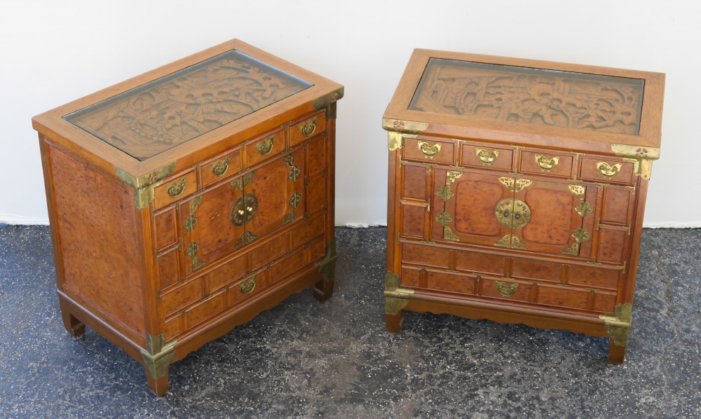 PAIR OF SMALL CHINESE CHESTS: Inset glass top over carved panel with oriental outdoor genre scenes. 4 small drawers over 2 doors over full length drawer, all with brass hardware. Measures 23 3/4'' h. x 24'' x 15''.
