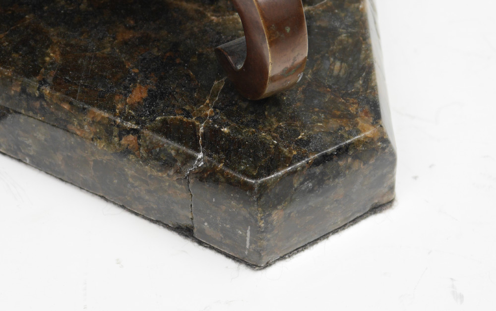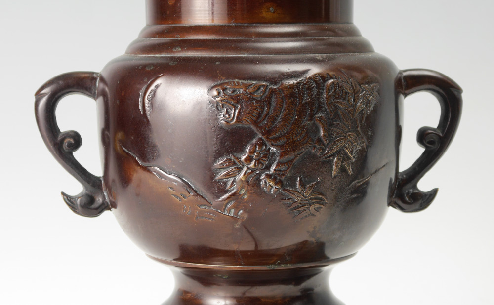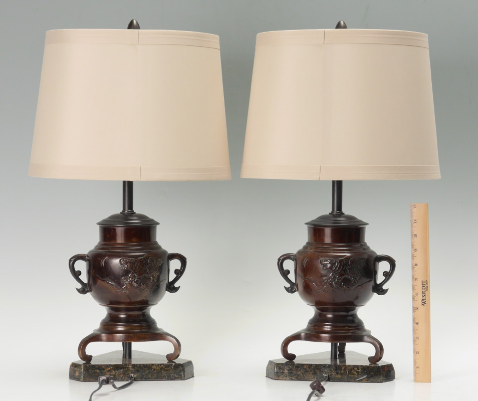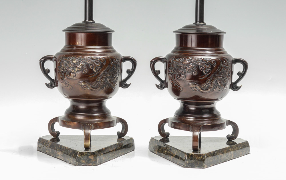 PAIR MARBRO DECORATIVE BRONZE LAMPS: Chinese bronze urns converted to lamps by the Marbro Lamp Co. Los Angeles, California. 12 1/2 overall. Mounted on marble. Dragon design with tiger verso. Measures approx. 12.5'' tall.
