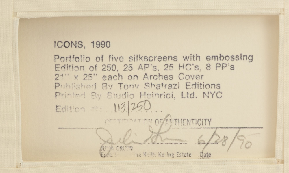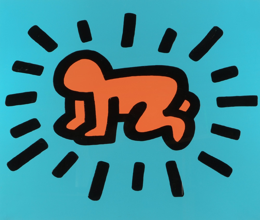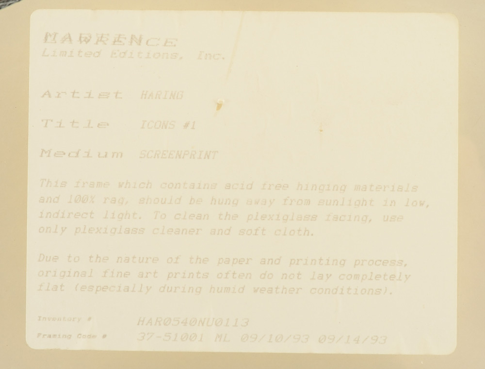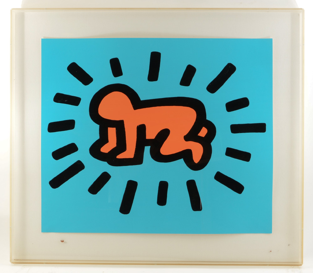 HARING, Keith, (American, 1958-1990): ''Radiant Baby'', Screenprint, 21'' x 25'', 1990 Icon Series #1, plexiglass frame, 27'' x 31'', Martin Lawrence Galleries label verso with signed COA from Julia Braun.