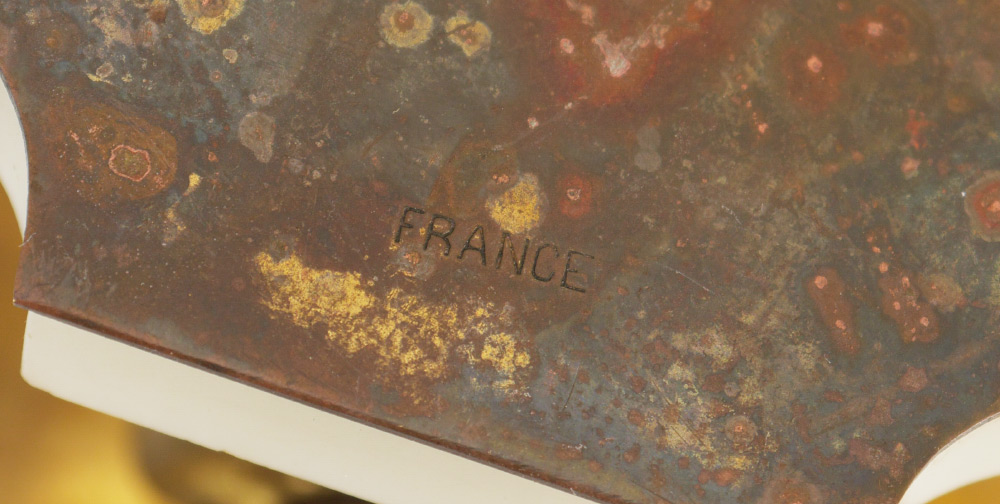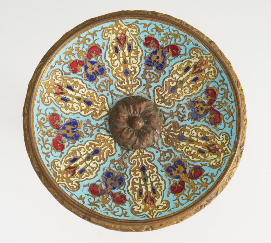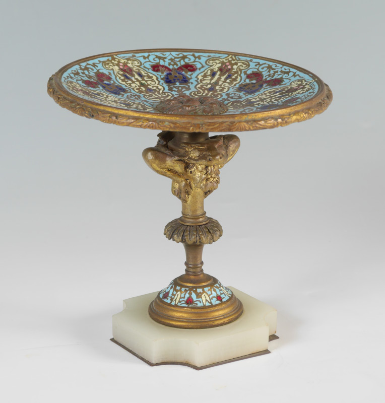 FRENCH ENAMELED BRONZE COMPOTE: Enameled top bowl, figural support with 2 sided bust of man, onyx and metal base. No visible signature or mark, 6 1/4'' h. x 6 1/2''.