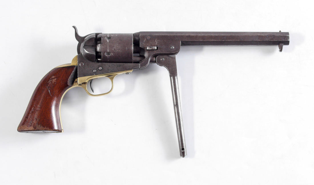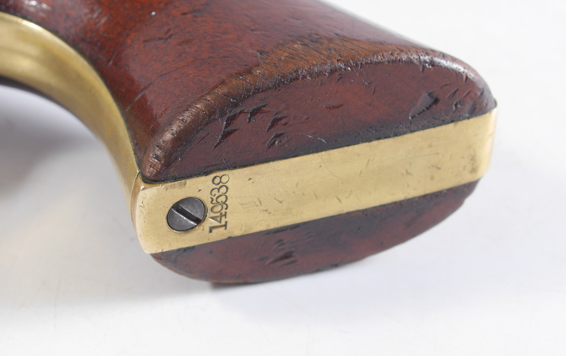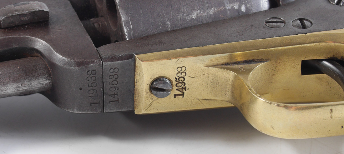 CIVIL WAR ERA 1851 COLT NAVY REVOLVER: All matching serial number 149538 including the wedge, fourth model, dates to 1863 production. 7 1/2'' octagonal .36 caliber barrel, walnut grips appear to be original. Partial cylinder scene remains, New York address on barrel. Action currently works fine. Overall 13'' long.