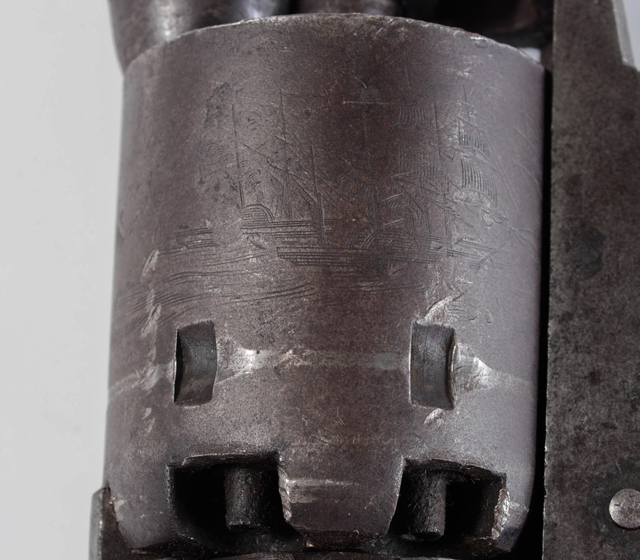 CONDITION: Missing wedge screw, chip to right hand side grips next to frame, rub ring around cylinder. BURCHARD GALLERIES DOES NOT ENDORSE THE FIRING OF ANY ANTIQUE FIREARM.