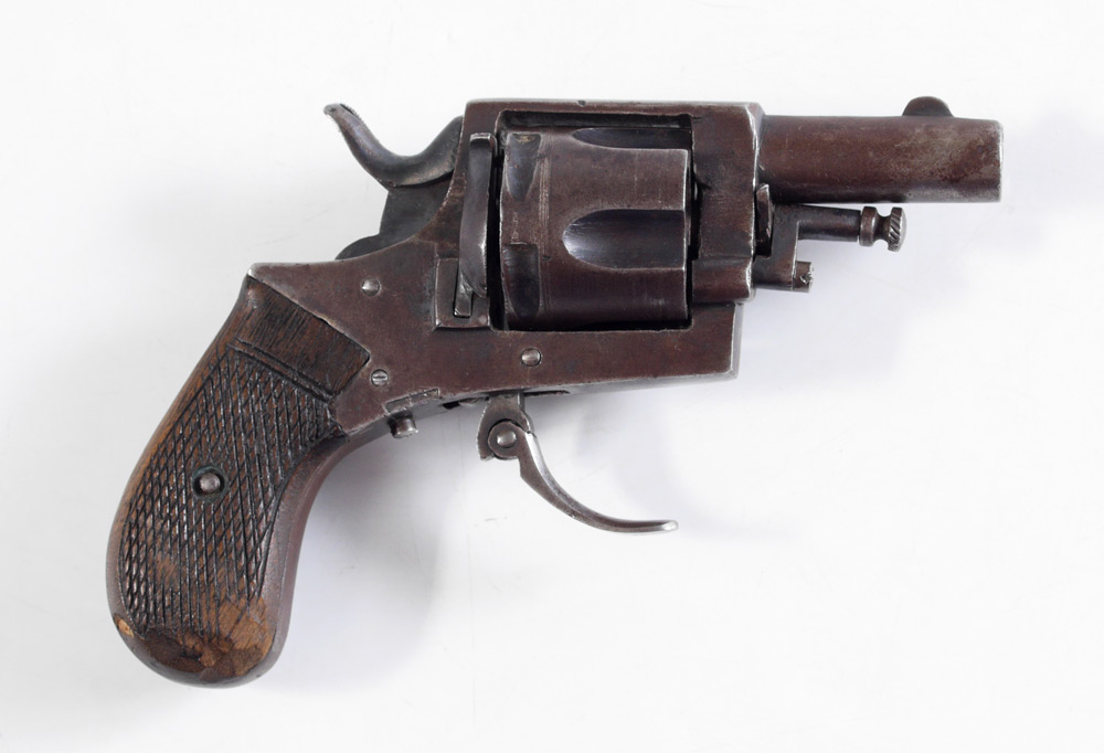 ANTIQUE CONTINENTAL PINFIRE REVOLVER: Unmarked as to maker, approx. .38 caliber 2'' round barrel. 5 shot cylinder, checkered wood grips, hinged spur trigger. Pre-1898 manufacture, action currently working, overall 5 1/2'' long.