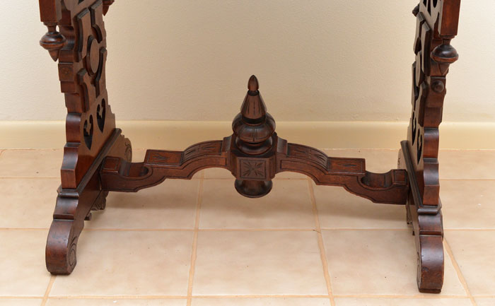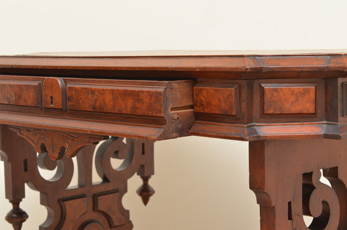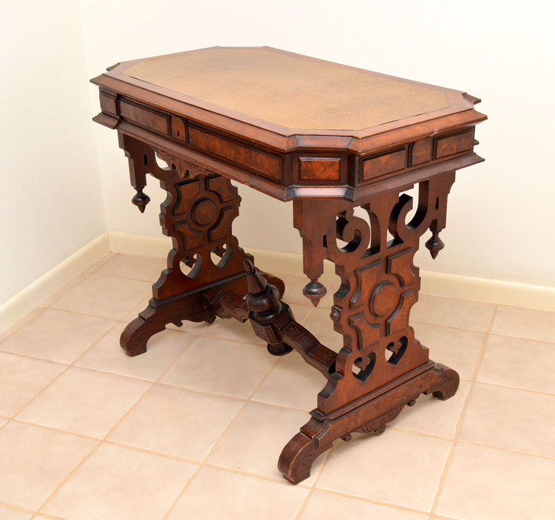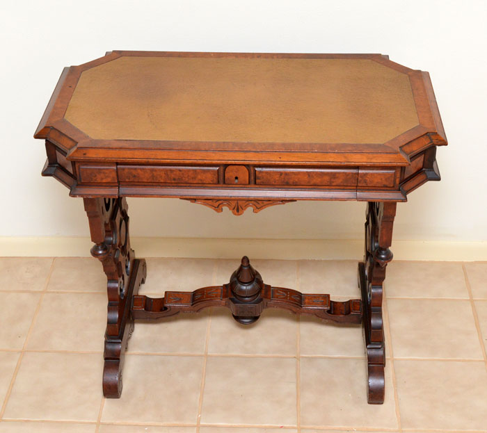 CARVED VICTORIAN LEATHER TOP WORK TABLE: Inset leather top, skirt with single drawer, burl veneer accents. Carved and shaped pedestal supports and stretcher, overall measures 29 3/4'' h. x 26'' x 21''.