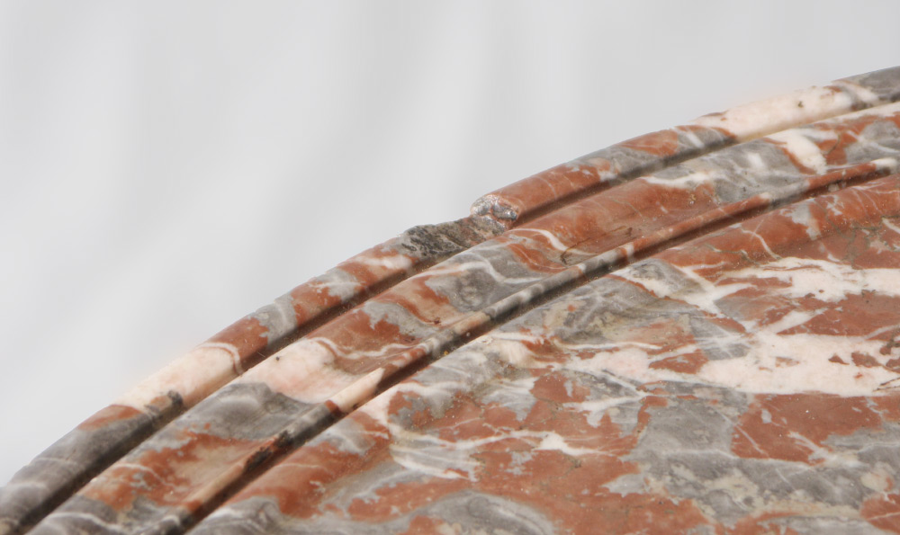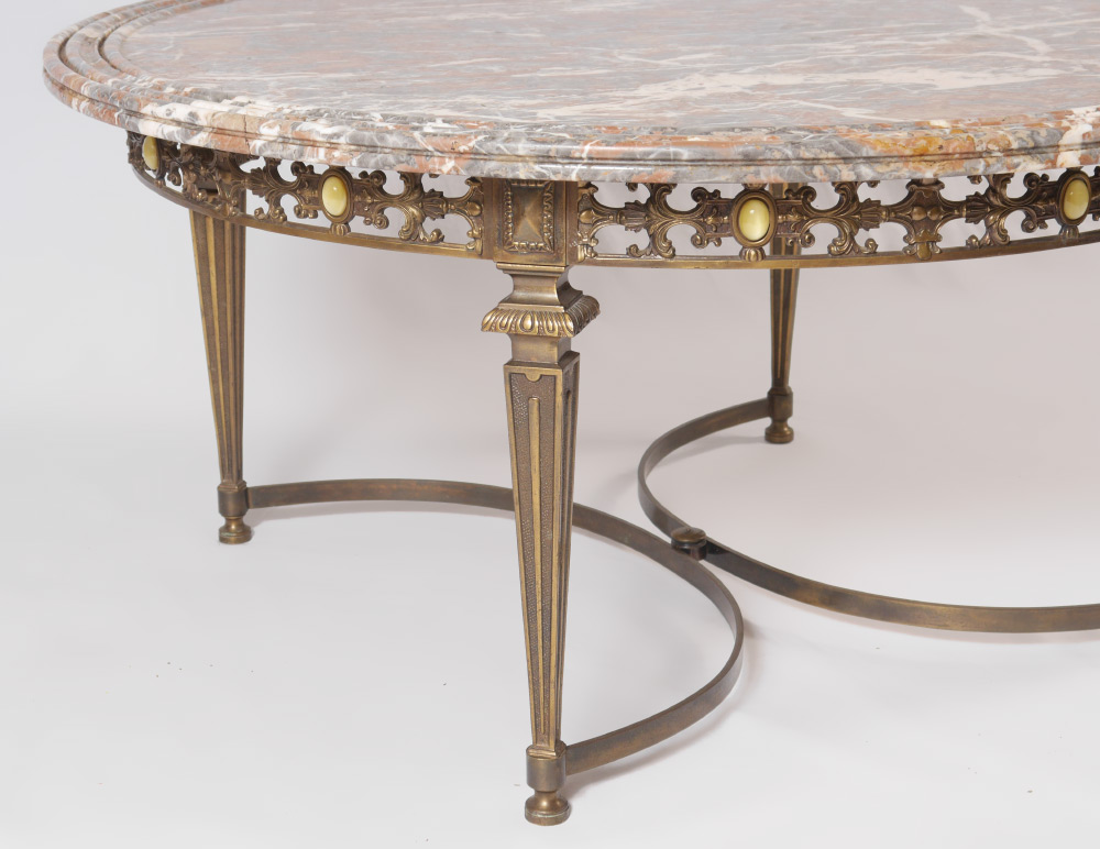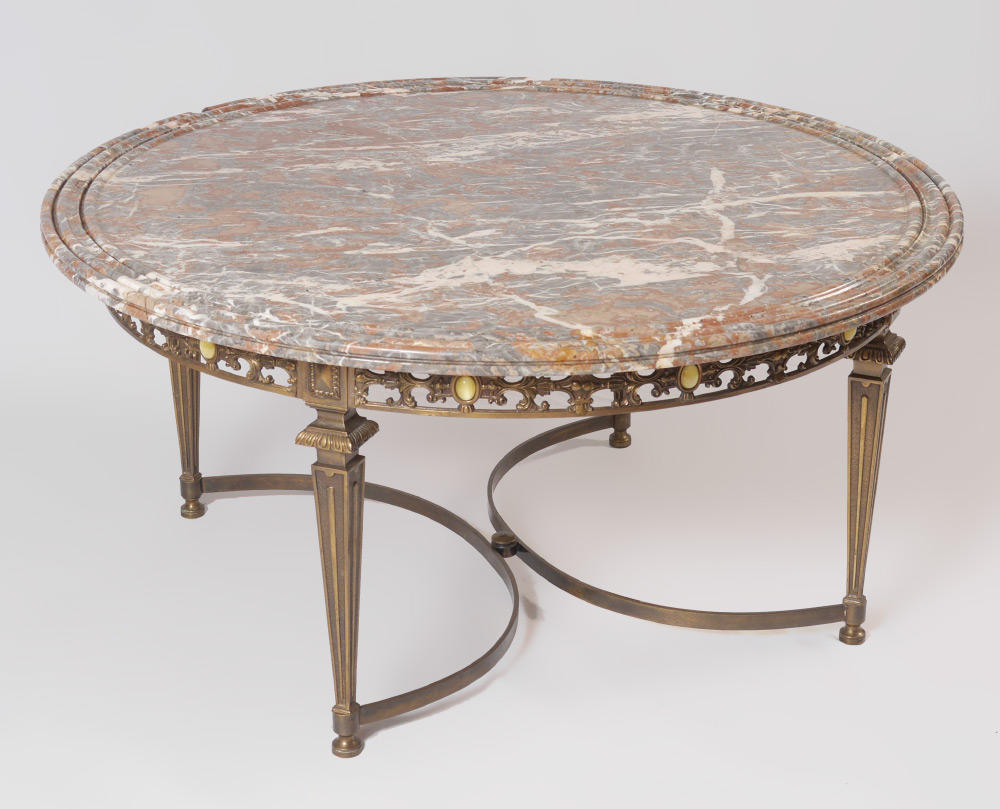 MARBLE TOP COFFEE TABLE WITH METAL BASE: Round marble top with grooved edge. Cast metal base, open work apron with applied cabochons, tapered legs, semi circle stretchers. Overall measures 19'' h. x 39 1/4''.