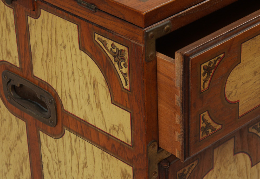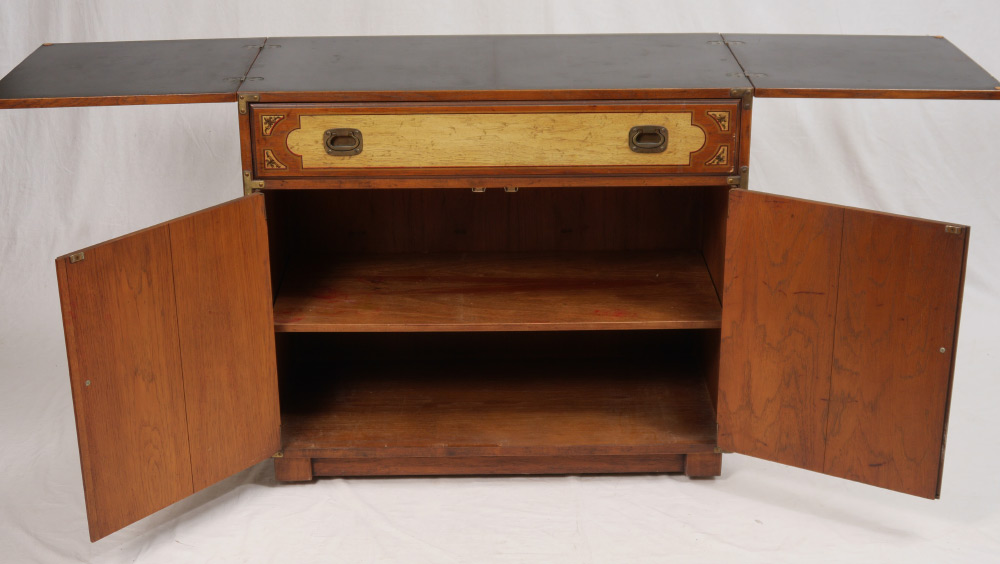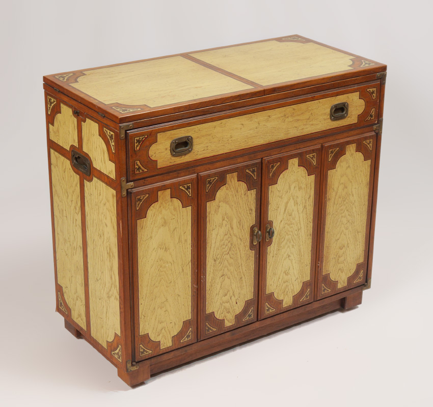 DREXEL ORIENTAL STYLE BAR CABINET: Oriental campaign style double lift top over single drawer over 2 doors, marked Drexel inside drawer, all on castors, overall measures 34 1/2'' h. x 38'' x 18 1/2''.