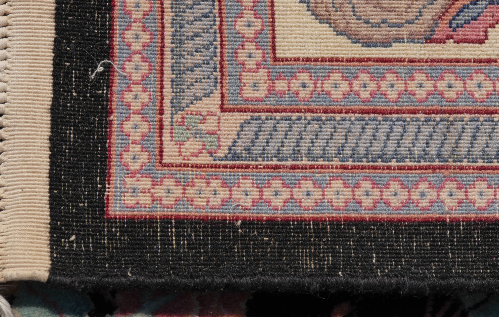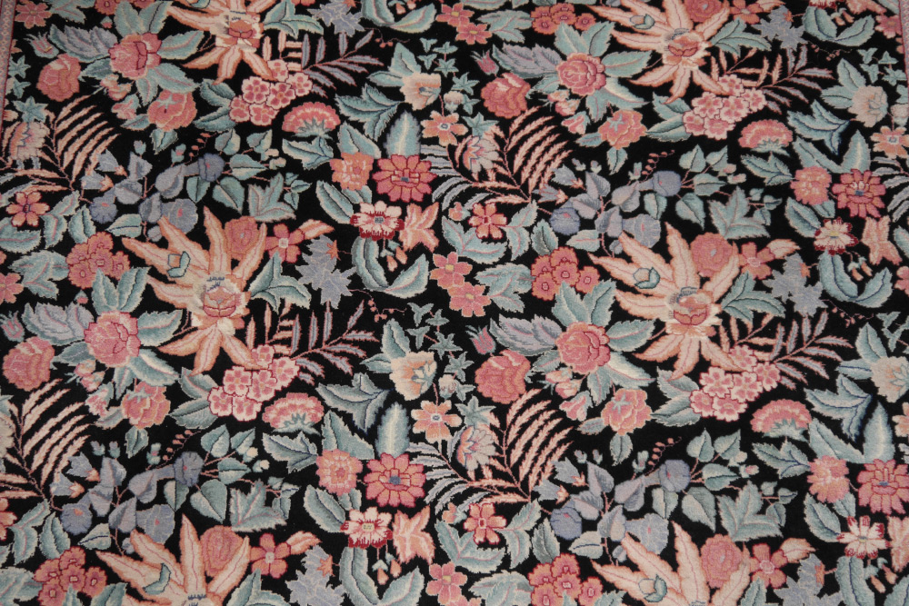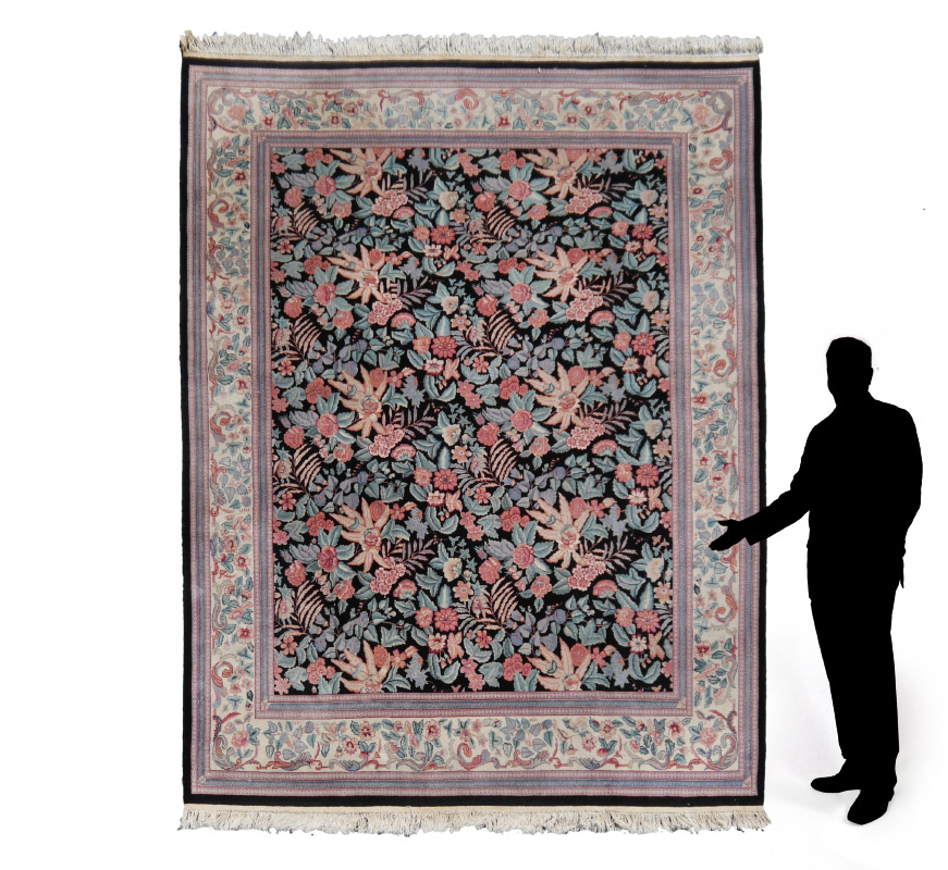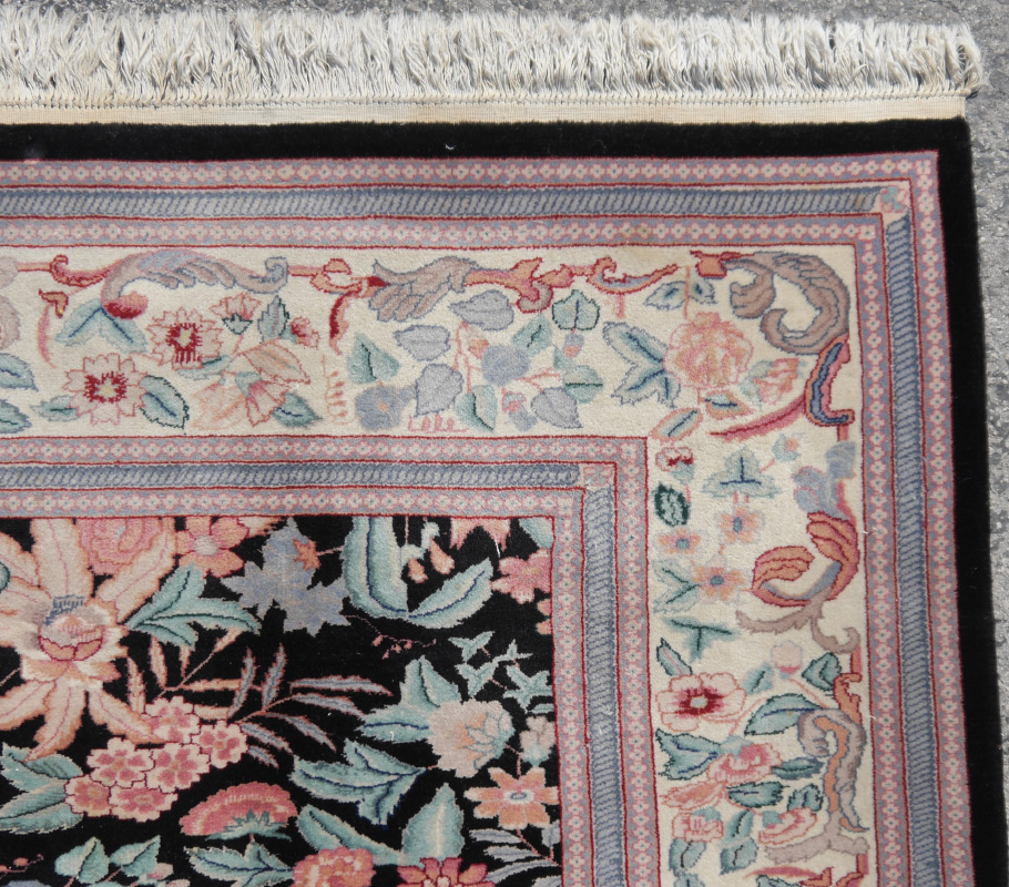 APPROX. 20-35 YR OLD SINO-PERSIAN HAND KNOTTED WOOL RUG, 8'2'' x 10': Large pastel colored leaves and flowers cover the black field like a lush jungle. A contrasting white ground main border with pastel colored guard borders frames the field. This nontraditional rug has a great decorator look for your home. Condition is good.