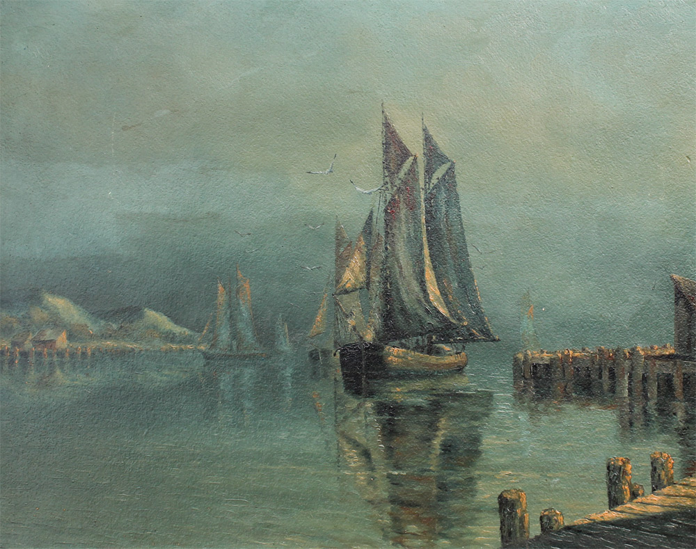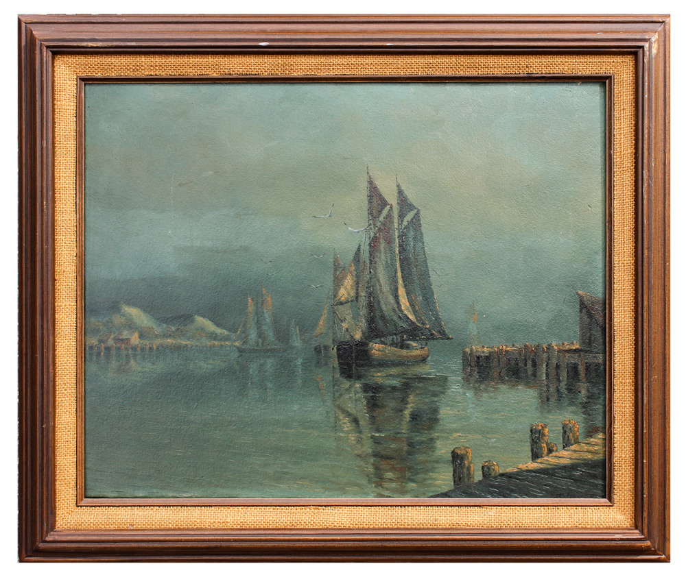 F.H. SMITH? NOCTURNAL DOCKSIDE PAINTING: Quiet Nocturnal Dockside Scene, Oil/Board, 16'' x 20'', indistinctly signed lower right, framed, 20.75'' x 24.75''.