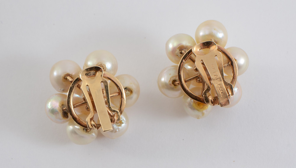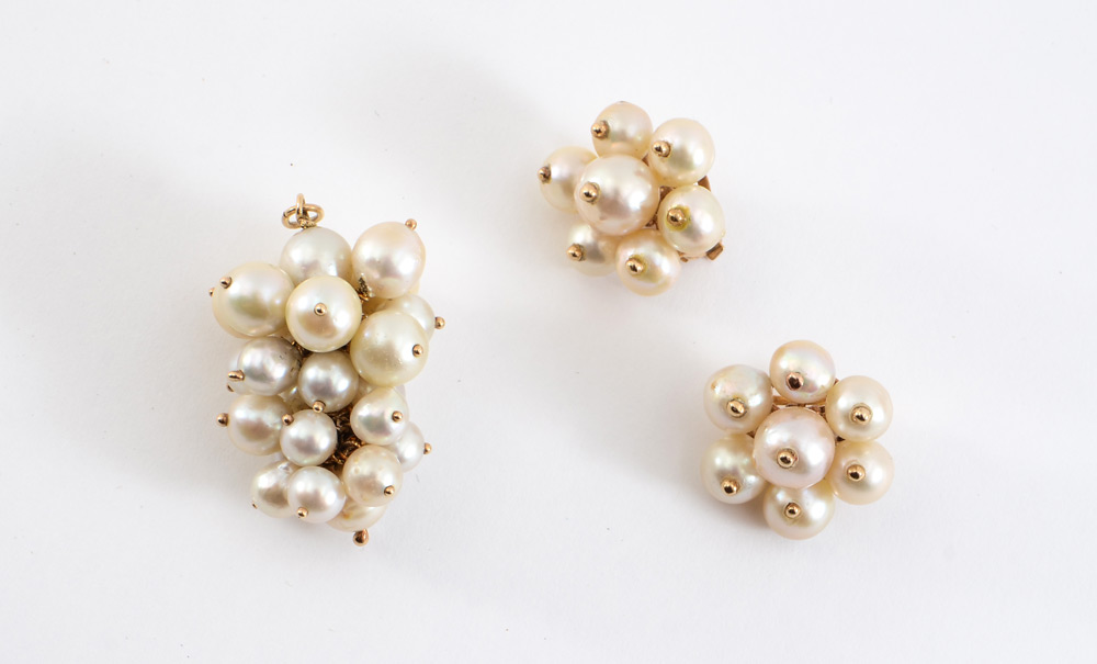 CULTURED PEARL PENDANT & EARRING SET: 14K yellow gold cluster cultured pearls, 6.00-9.00 mm., cream in color. Clip on earrings. The pendant measures 1.75'' length, the earrings 1'' dia. Gold weight approx. 5.0 grams.