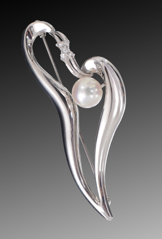 DIAMOND AND PEARL STYLIZED HEART BROOCH: 18K white gold pin centering a 7mm cultured pearl, white with rose overtones and high luster. The 5 diamonds total approx. .07 Ct. average VS clarity and G-H color. Length 2''. Weight 5 grams.