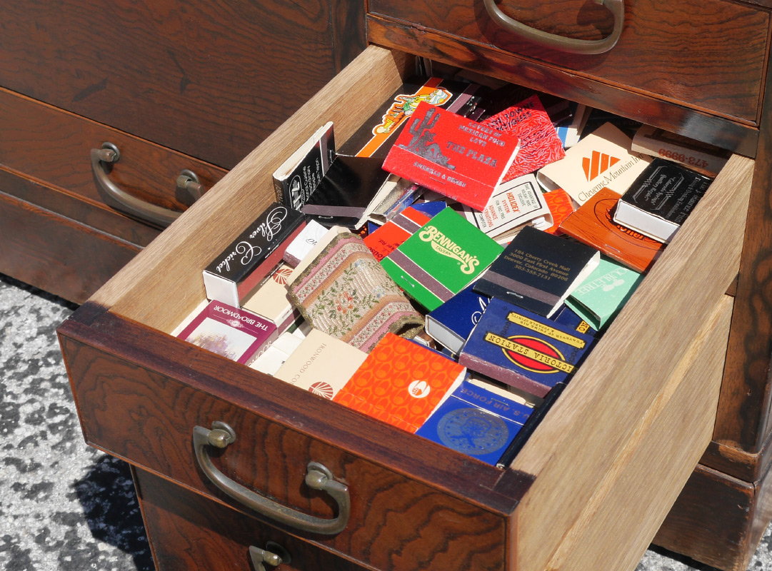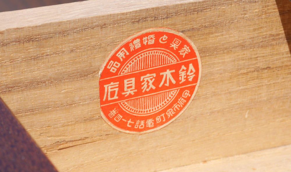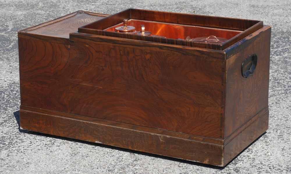 JAPANESE WOOD & COPPER HIBACHI: Copper lined insert with kettle and warmer, cabinet with 3 drawers right side, 2 drawer under insert, one filled with matchbooks. 18 1/4'' h. x 35 1/4'' x 18''.