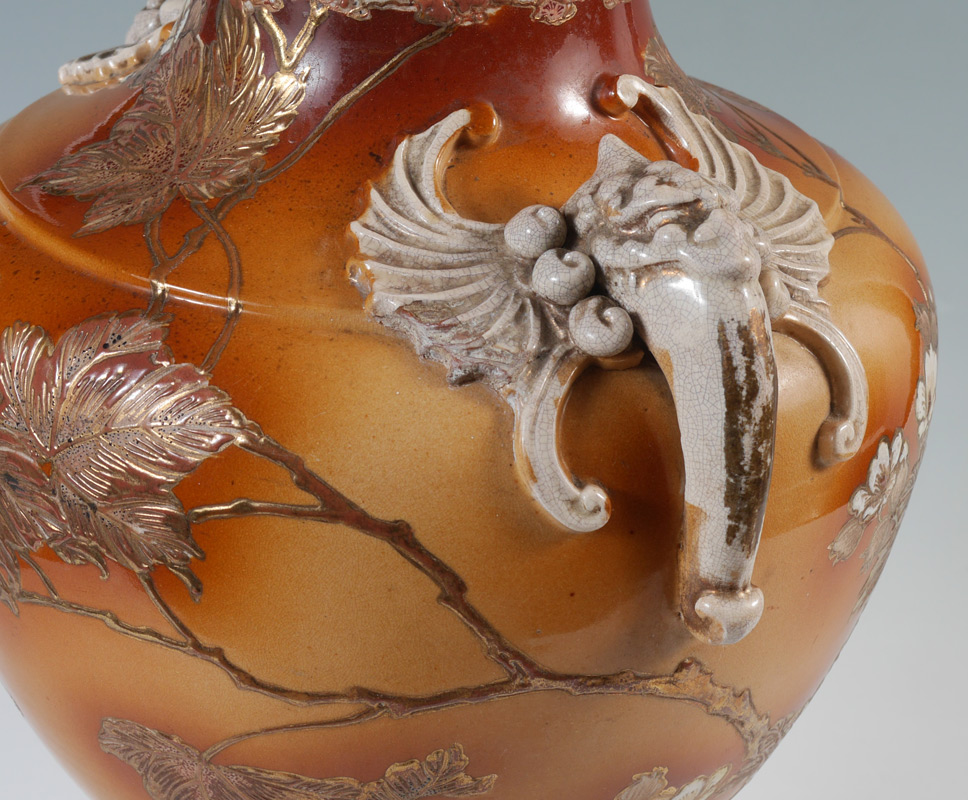 JAPANESE MORIAGE VASE: Urn form vase with applied elephant handles, satsuma style decoration, on base with 6 feet. Signed on base, overall 20 1/4'' h. x 13 1/2''.