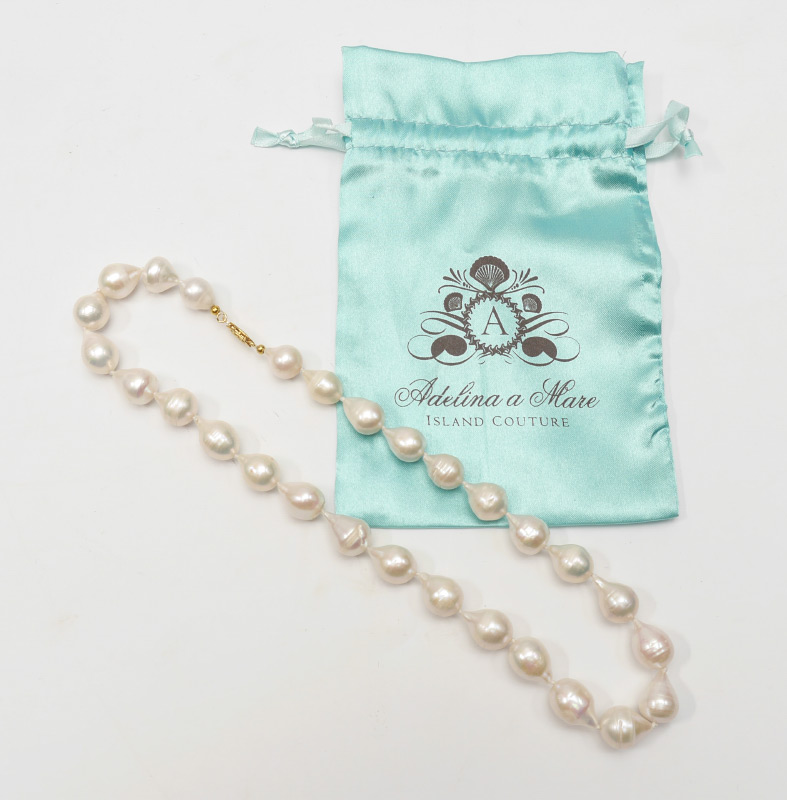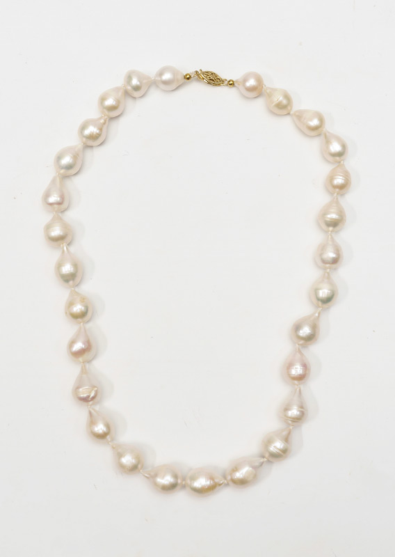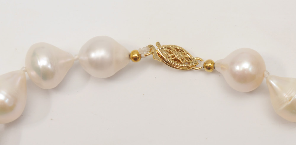 BAROQUE FRESHWATER PEARLS: Drop shaped 11 mm with non gold clasp. 18'' length.