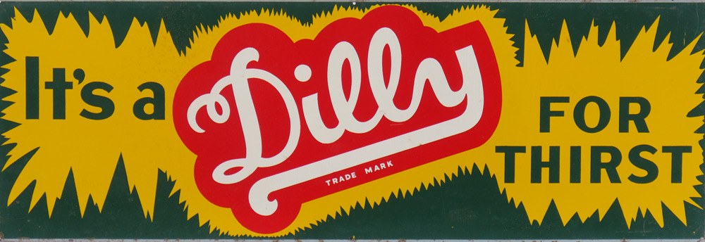 IT'S A DILLY TIN LITHOGRAPH ADVERTISING SIGN: Green ground, ''It's a Dilly for Thirst'', 12 1/4'' x 36''.