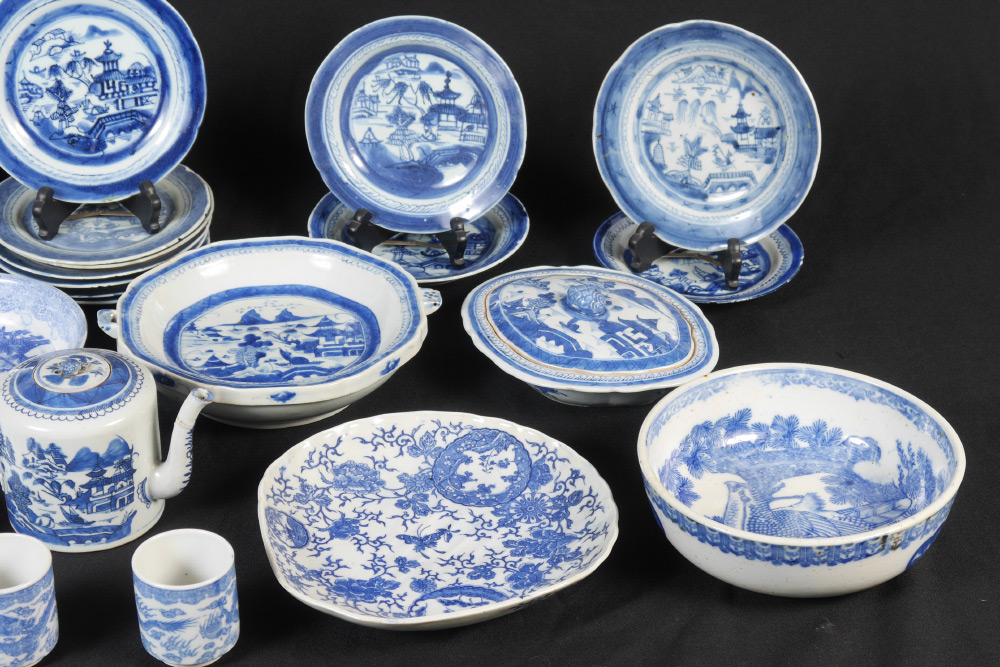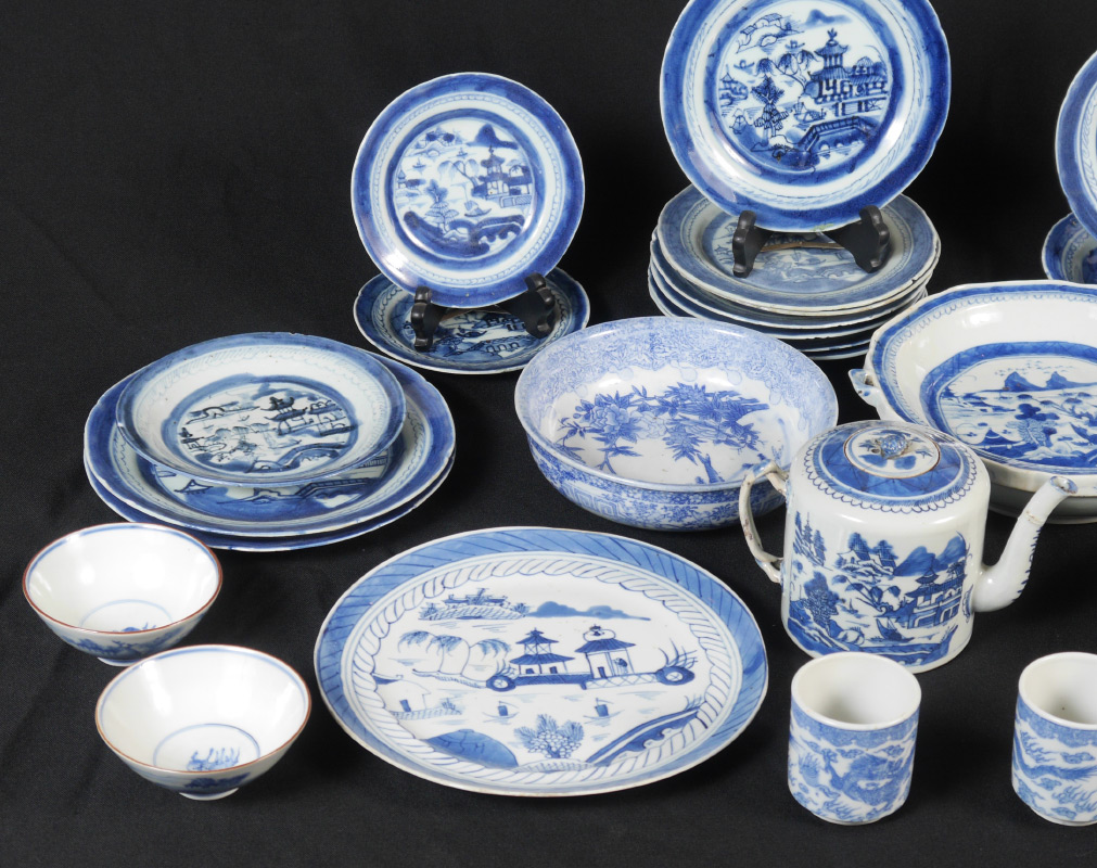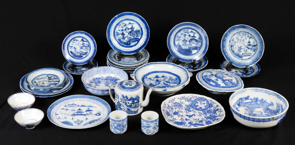 26 PIECE COLLECTION OF BLUE & WHITE CANTON CHINA: Approx. 26 pieces total to include hot water heated serving dish, teapot (5'' h. x 7 1/2''), serving bowl (3'' h. x 8 3/4''), smaller bowl, covered vegetable, assorted plates.