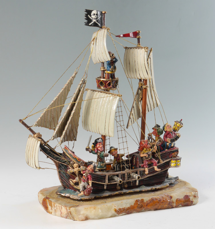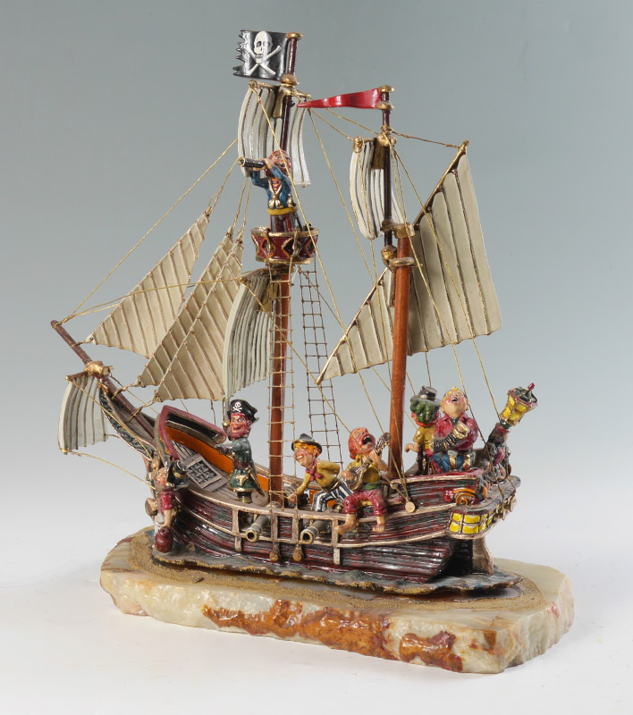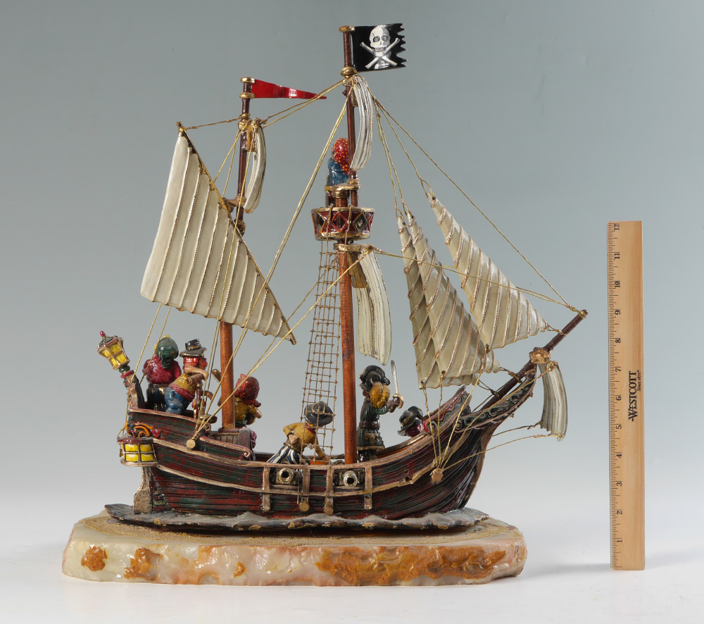 RON LEE PIRATE SHIP SCULPTURE: Composite sculpture of pirate ship with pirates, affixed to heavy onyx base, signed Ron, '85. Measures 19'' h. x 17'' x 8''.