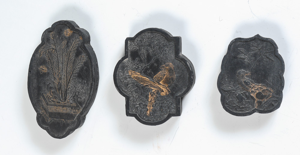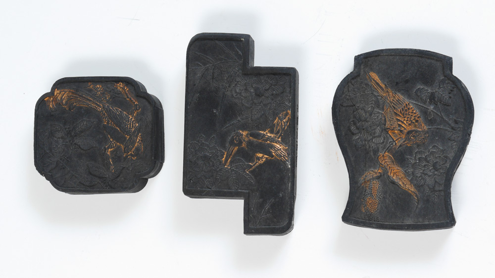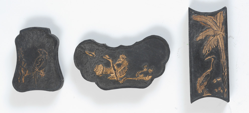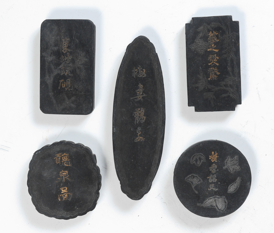 2 SETS CHINESE CARVED STONE INK BLOCKS: 2 sets total, each in fitted presentation box, one with 5 stones, the other with 9 stones. Each stone with carved scene on one side, many with gold gilt accents, and verses or prayers on the other side. Larger box measures 3/4'' x 11'' x 7 3/4''.