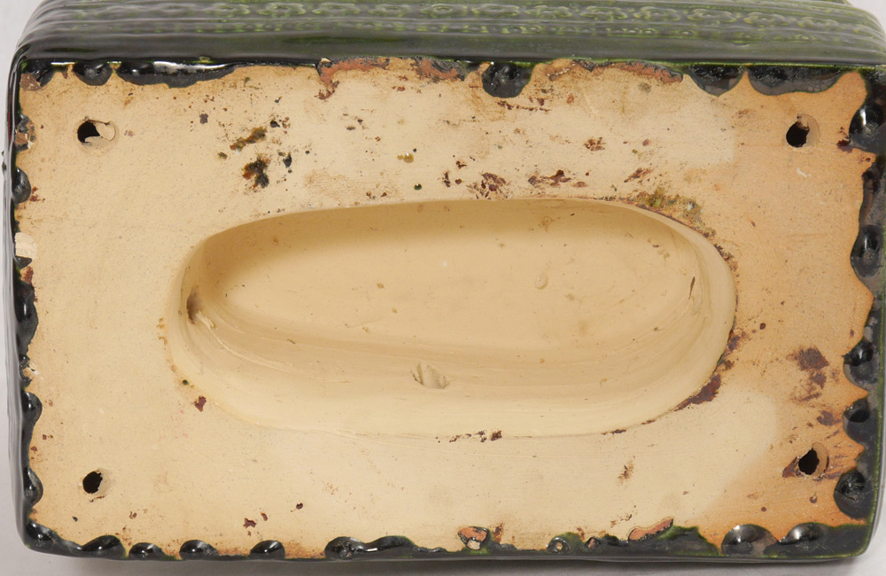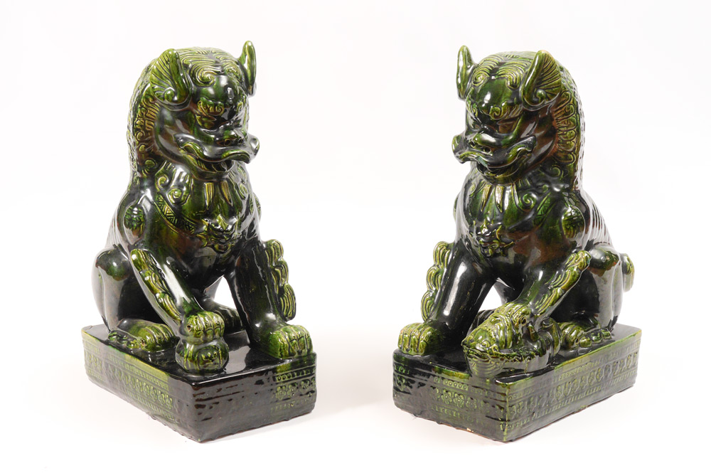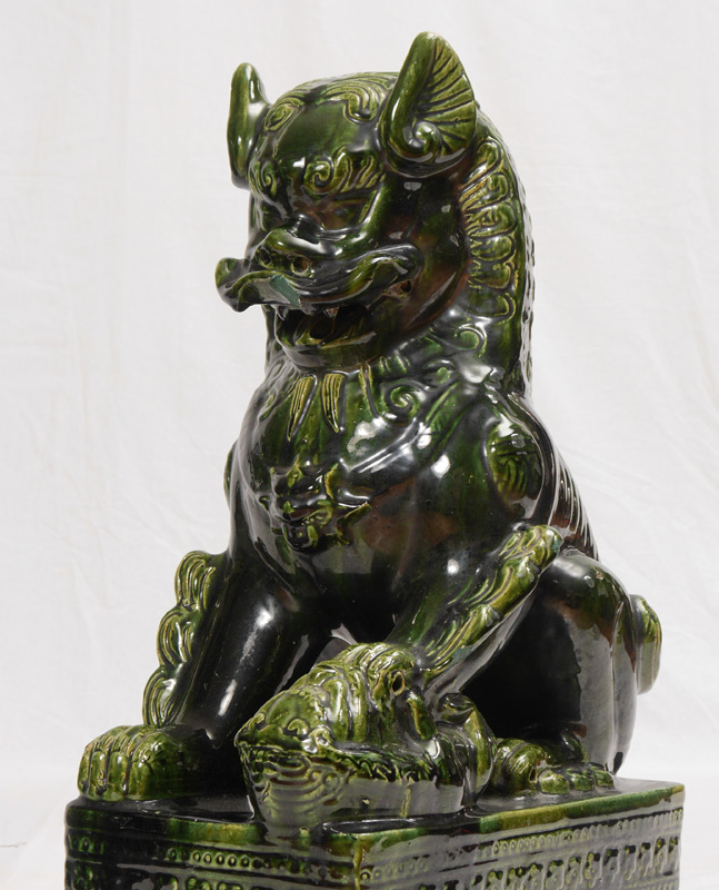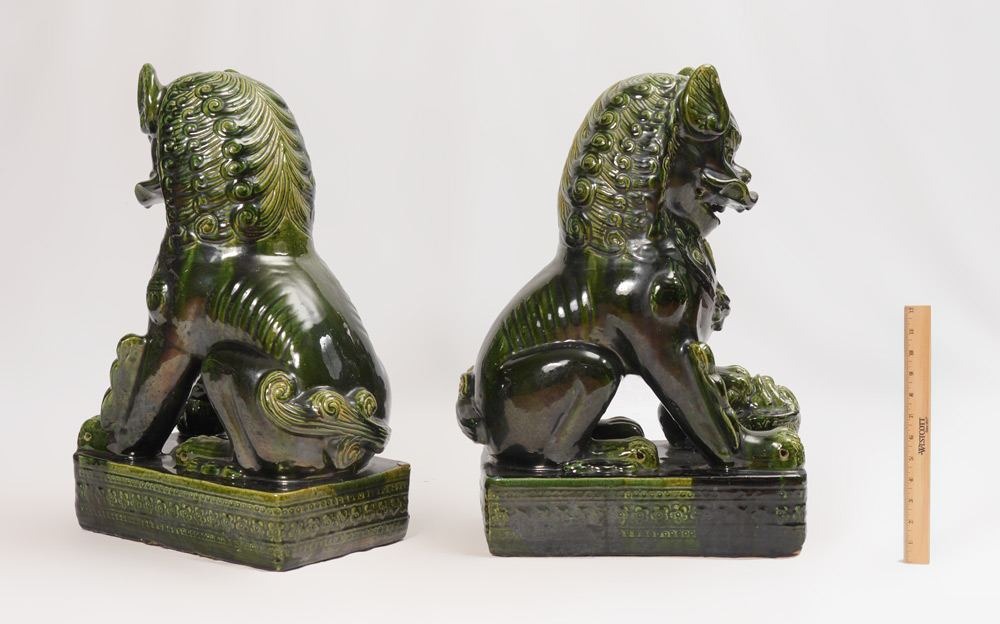 PAIR LARGE CHINESE GREEN GLAZE EARTHENWARE FOO DOGS: Matched pair, hollow, dark green glaze, 24'' h. x 15 1/2'' x 12''.