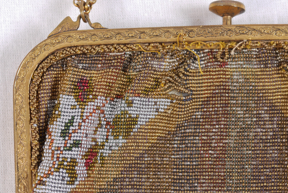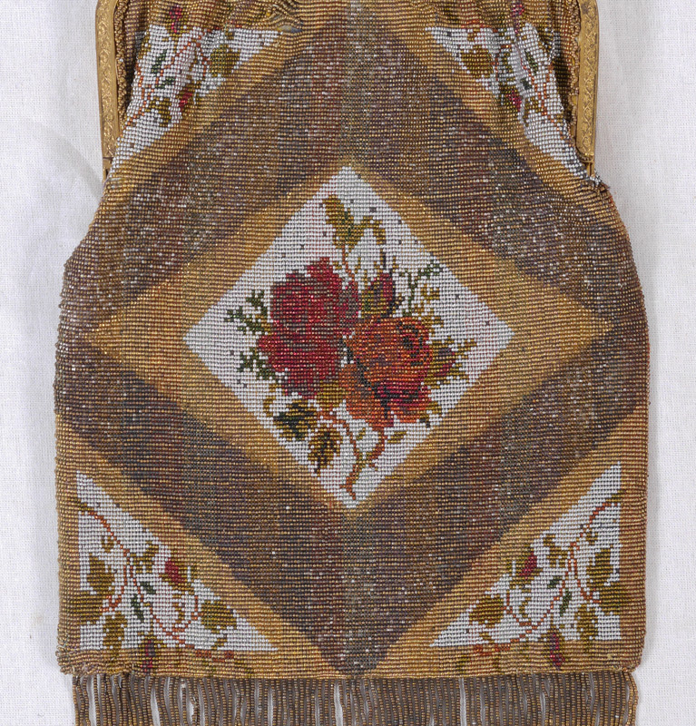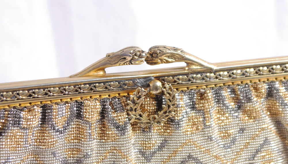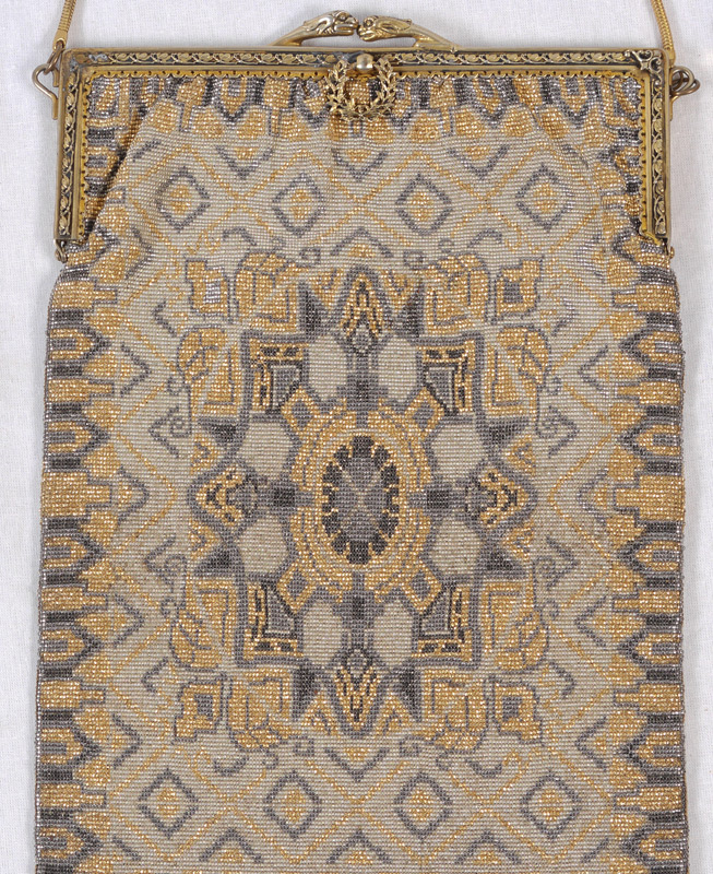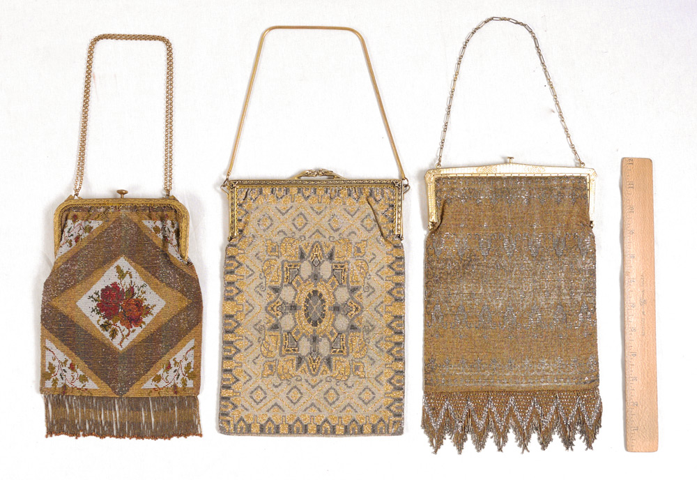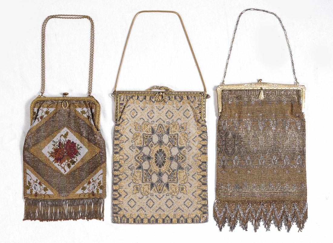 GROUP OF 3 VINTAGE CUT STEEL PURSES: 1) French with a red flower and geometric design, double chain, great fringe, new lining, 9 1/2'' x 6 1/2''. 2) Art Deco design in a soothing blue and cream coloration, double gargoyle snap clasp, 10 1/2'' x 7 1/4''. 3) Art Deco in neutral metallic colors, fringe in staggering lengths, worn lining, 10 1/2'' x 7''.