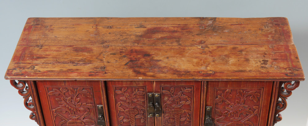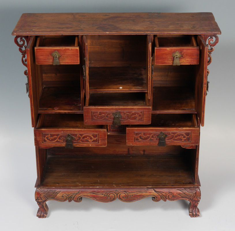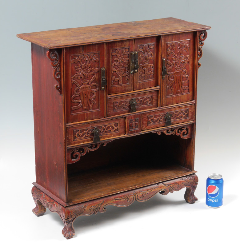 SMALL CARVED ORIENTAL ALTAR CABINET: Double board top with through tenons, open work decoration on sides, multiple drawers and doors over open storage, carved skirt, paw feet. Overall measures 27 1/4'' h. x 26 1/2'' x 9 1/2''.