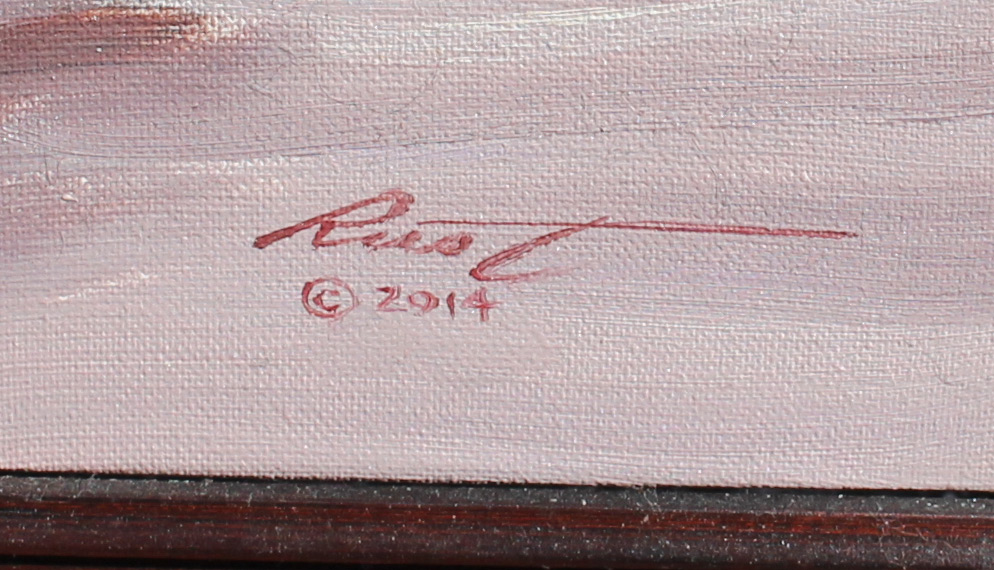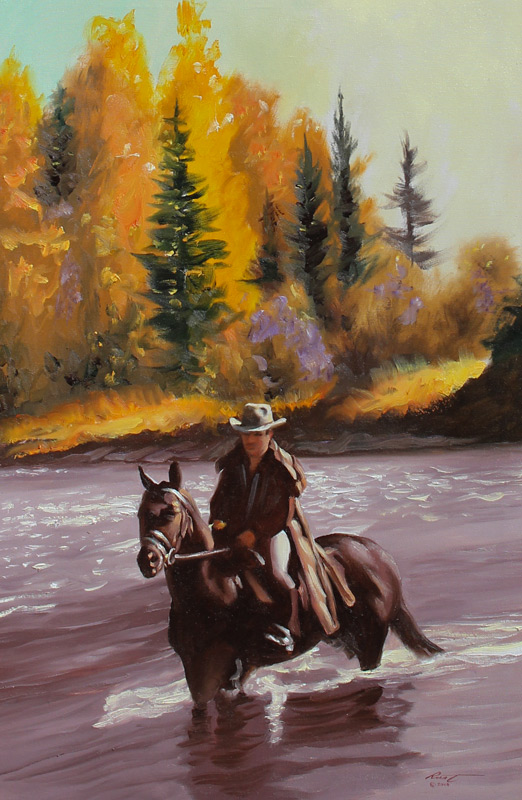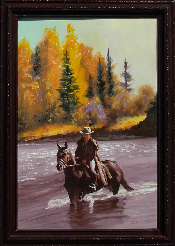 RUST, Don, (American, 1932-): Cowboy on Horseback Crossing River, Oil/Canvas, 36'' x 24'', signed lower right, dated 2014, framed, 42'' x 30''.