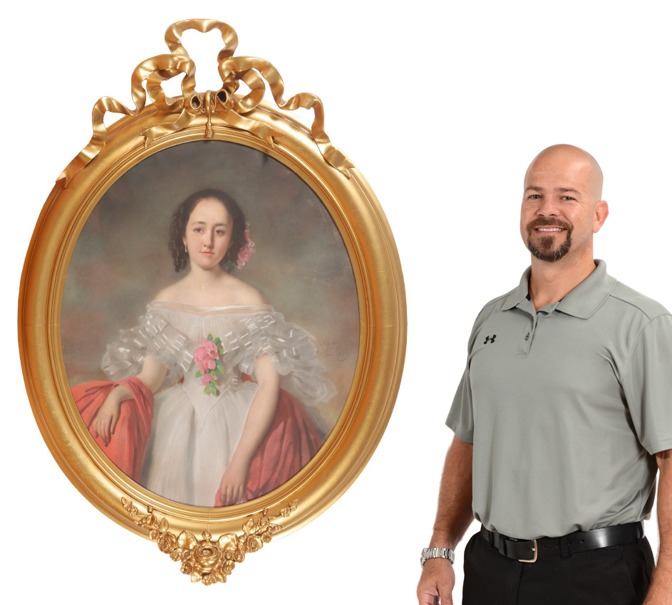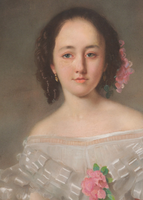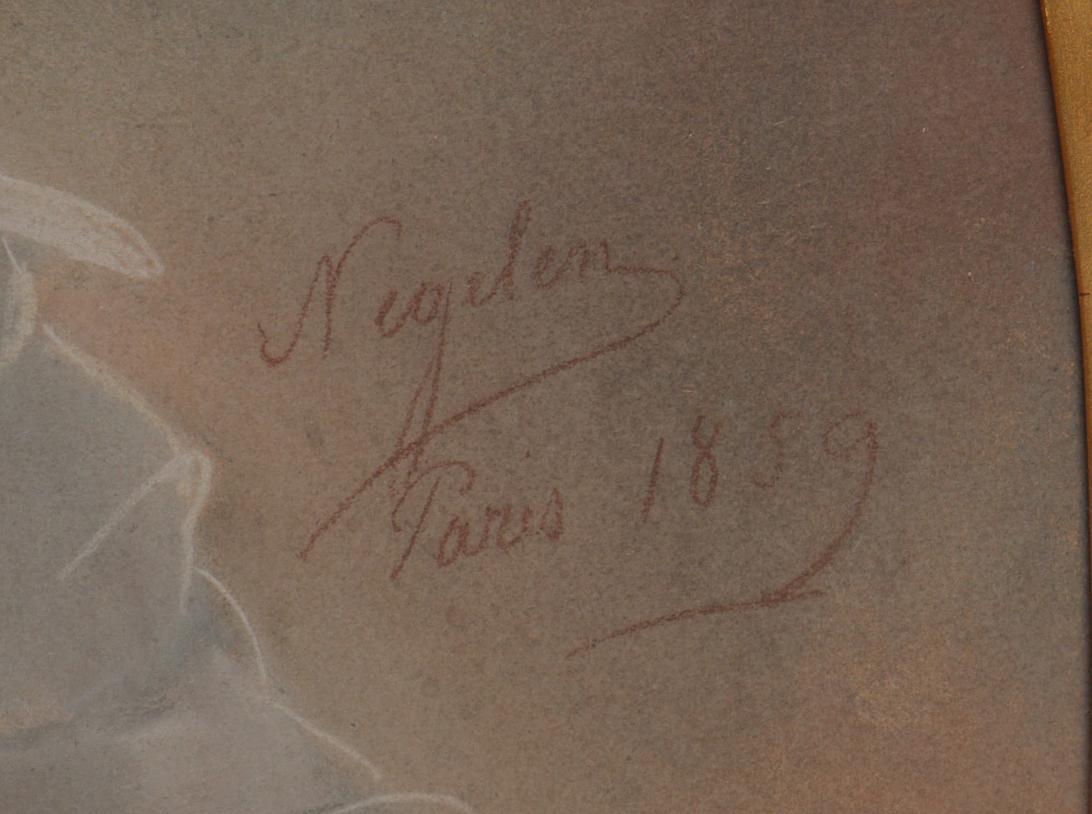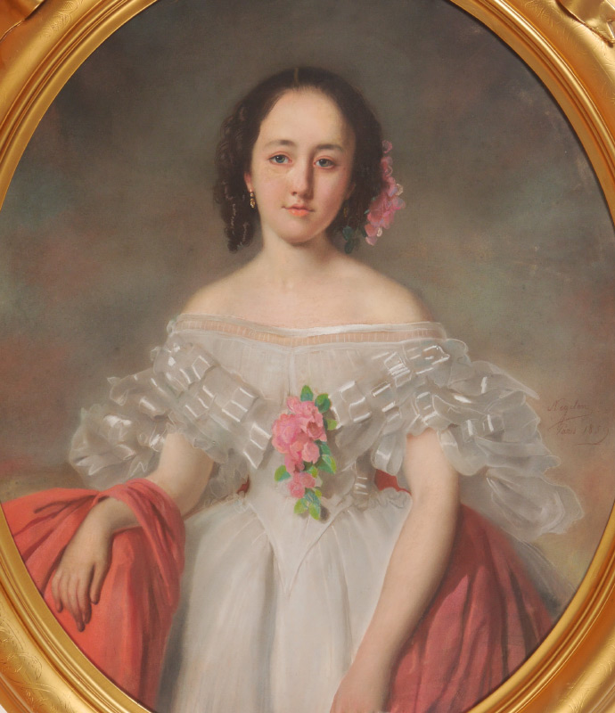NEGELEN, Joseph, (Swiss, 1792-1870): Portrait of a Young Victorian Girl, Pastel, oval sight size 39.25'' x 31.5'', signed in the right margin Negelen Paris 1859, encased in elaborate period foliate and ribbon motif frame with incised decoration and gesso scrolling bow pediment. Overall measures 59'' x 42''.