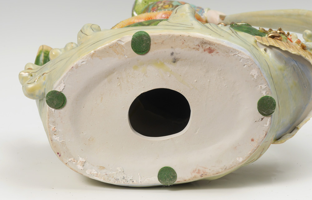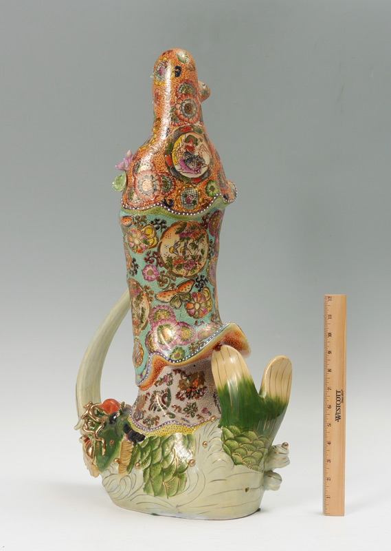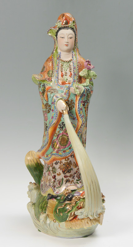 CHINESE POLYCHROME FIGURE OF QUAN YIN ON FISH: Polychrome decorated ceramic figure of Quan Yin or Guanyin holding a lotus blossom, standing atop a fish. No makers mark, measures 26'' h. x 14'' x 7''.