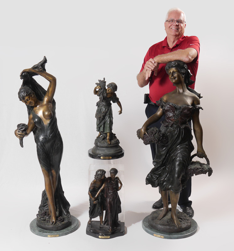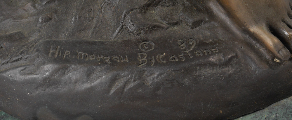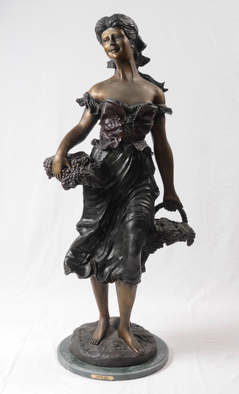 AFTER HYPOLITE MOREAU ''GRAPE GIRL'' BRONZE: Bronze figure of a maiden holding a basket of grapes, signed on base ''H. P. Moreau by Castano'' and dated '89. Affixed to marble base with brass plaque. Overall measures 53'' x 24''.
