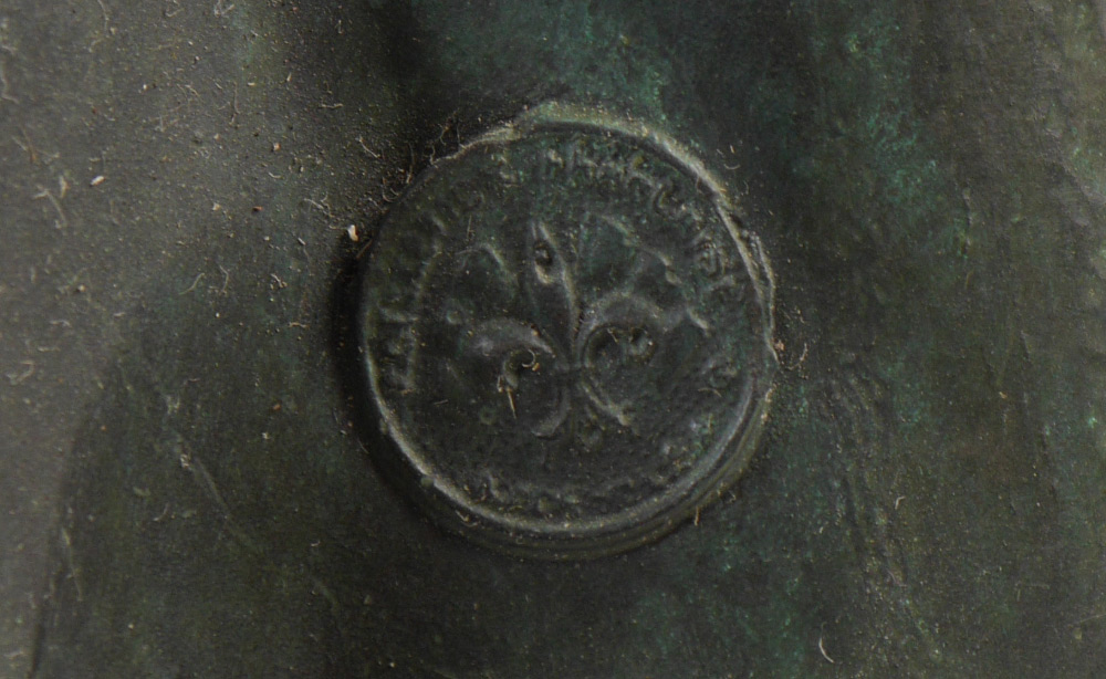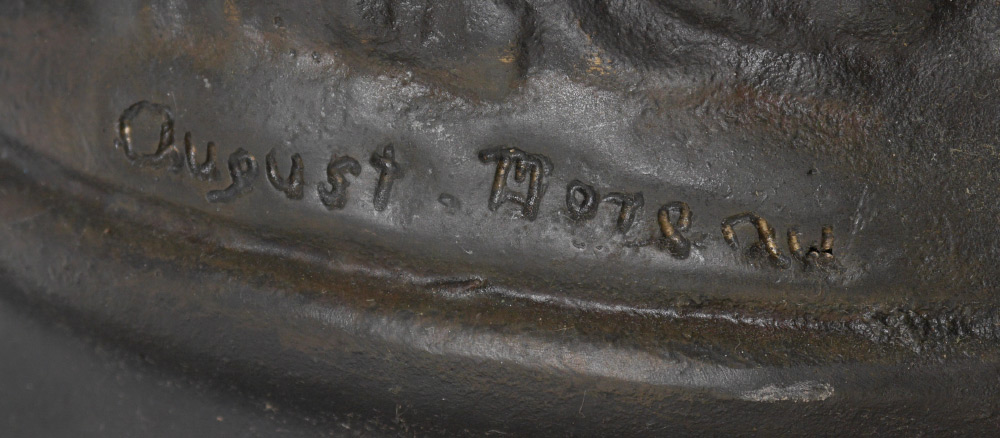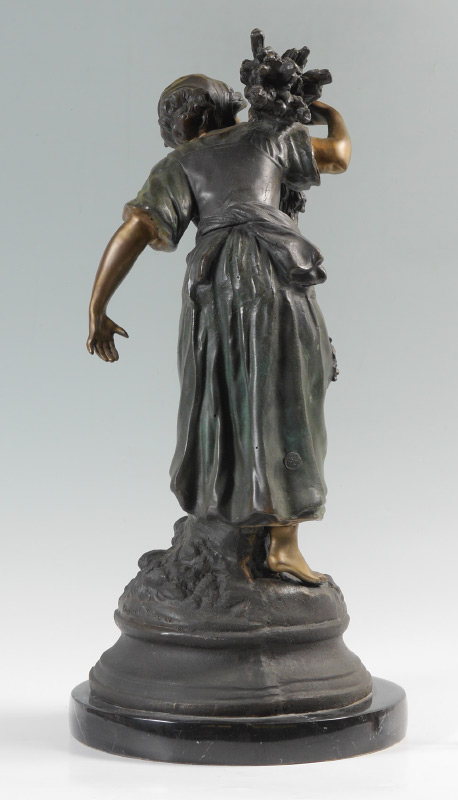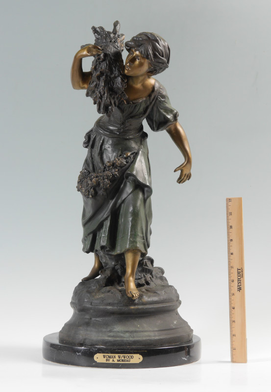 AFTER AUGUSTE MOREAU ''WOMAN WITH WOOD'' BRONZE SCULPTURE: Figure of a maiden carrying bundle of sticks, spurious French medallion, affixed to marble base with brass plaque, 26'' x 9 1/2''.