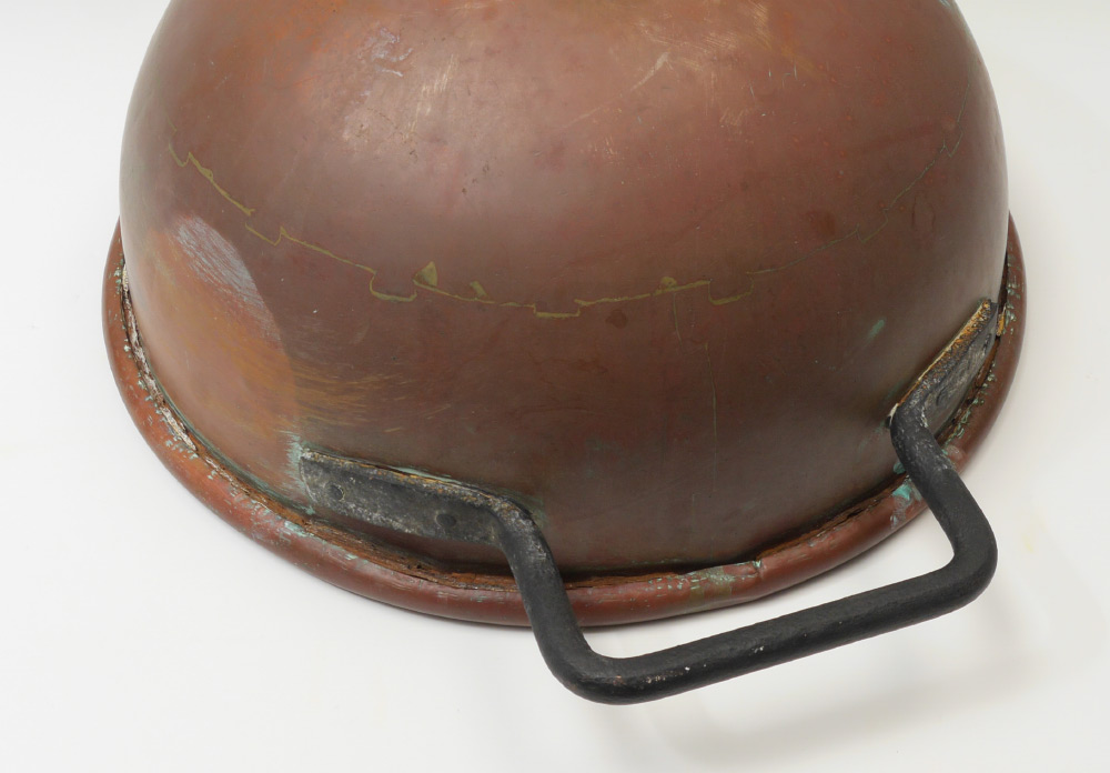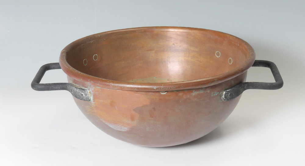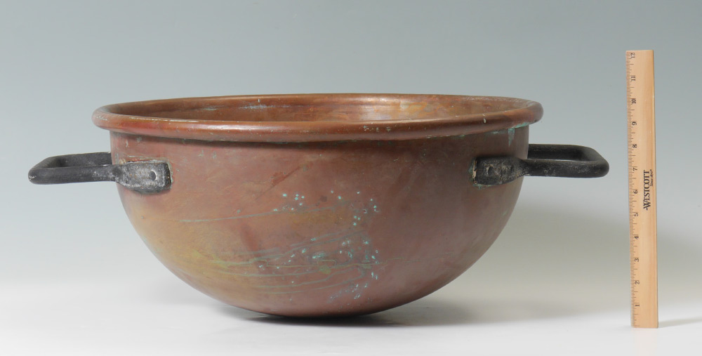 LARGE BRUCE & WEST COPPER DOUBLE HANDLE POT: Copper body in the form of a praline or candy kettle with 2 cast iron handles. Marked on side Bruce & West Mfg. Co., Cleveland O.. 9 3/4'' h. x 26 1/2''.