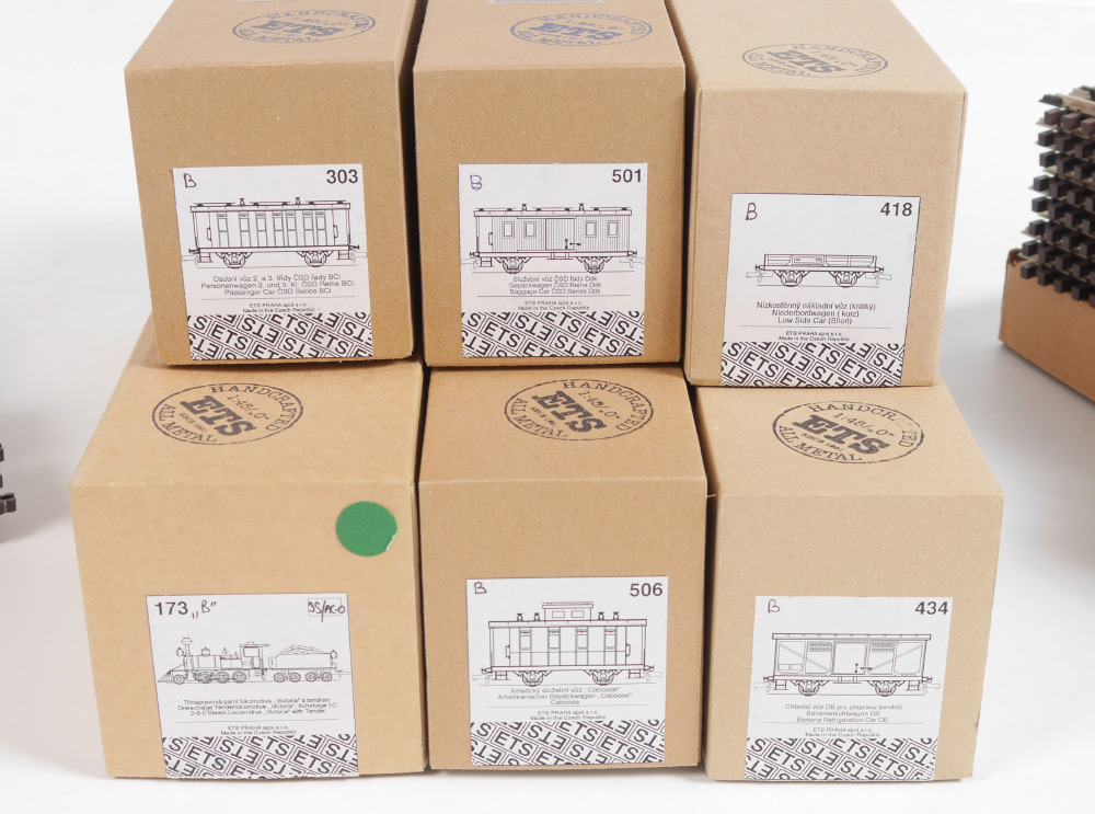 6 PIECE ETS-PRAHA MODEL TRAINS WITH TRACKS: ''O'' gauge, all in original boxes to include 1) #173, 2-6-0 ''Victoria'' with Tender, Colorado & Southern. 2) #501, Baggage Car CSD Series Ddk. 3) #434, Banana Refrigeration Car DB. 4) #418, Low Side Car (Short). 5) #506, Caboose, no markings. 6) #303, Passenger Car CSD Series BCi. Sold with loose tracks. This set retails for over $650.