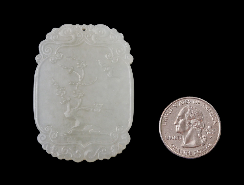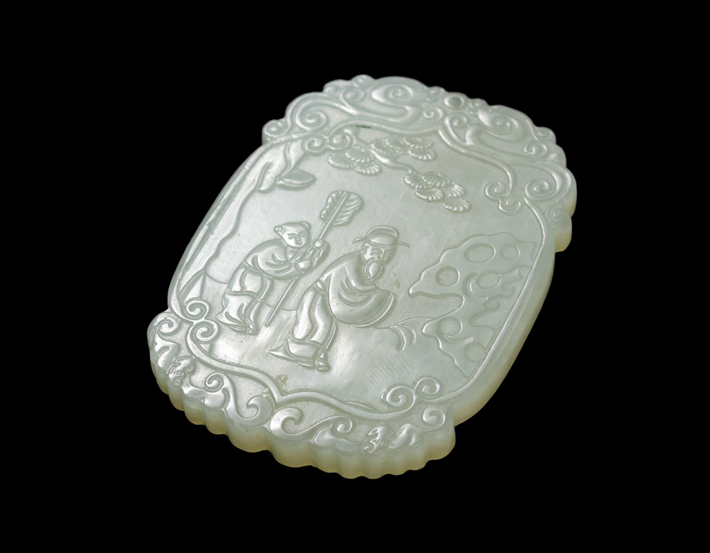 CARVED JADE PLAQUE: Carved tablet depicting figures in a garden. Measures approx. 2'' x 1.5''.