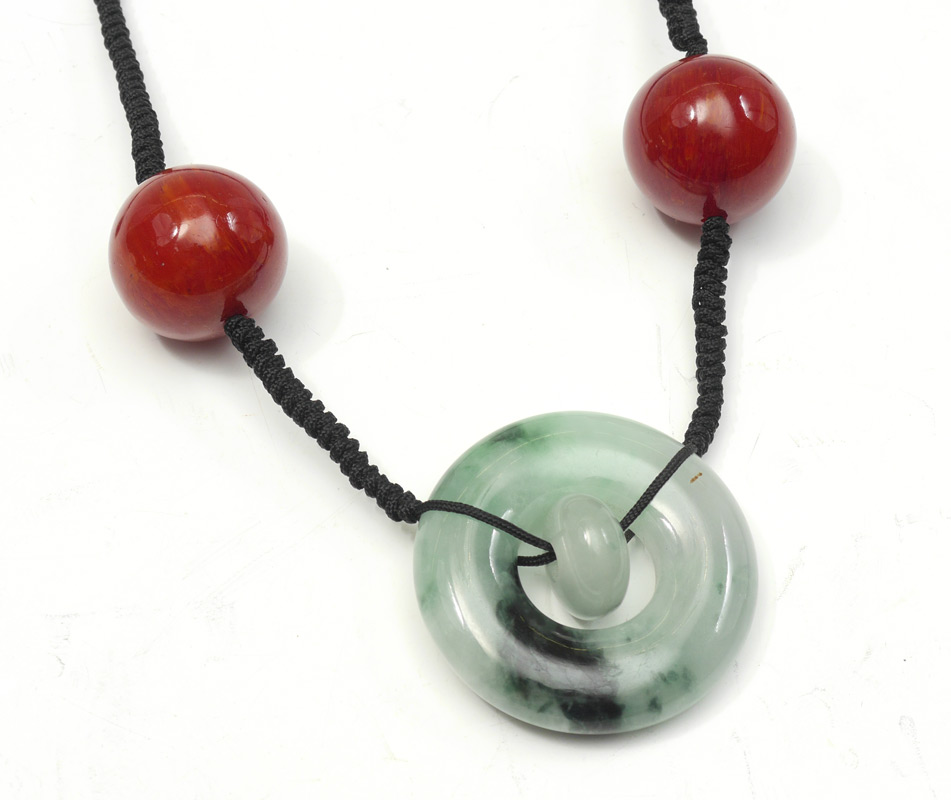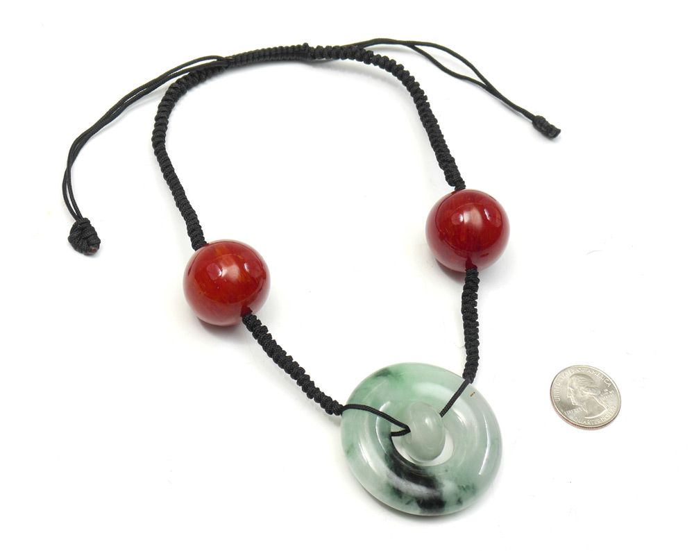 JADE DISC NECKLACE: Round disc suspended from an intricately wrapped black cord. The red beads are plastic. Disc measures 2'' dia. Adjustable length to 18''.