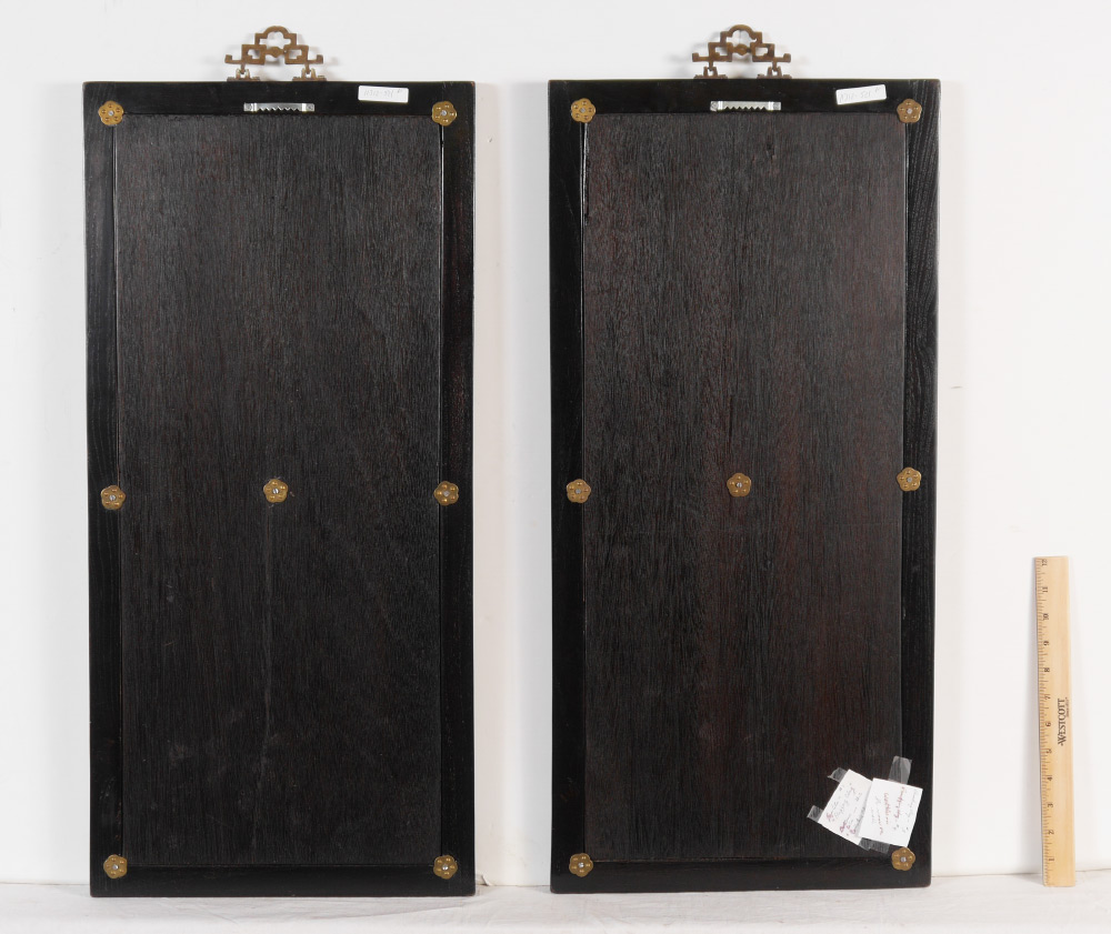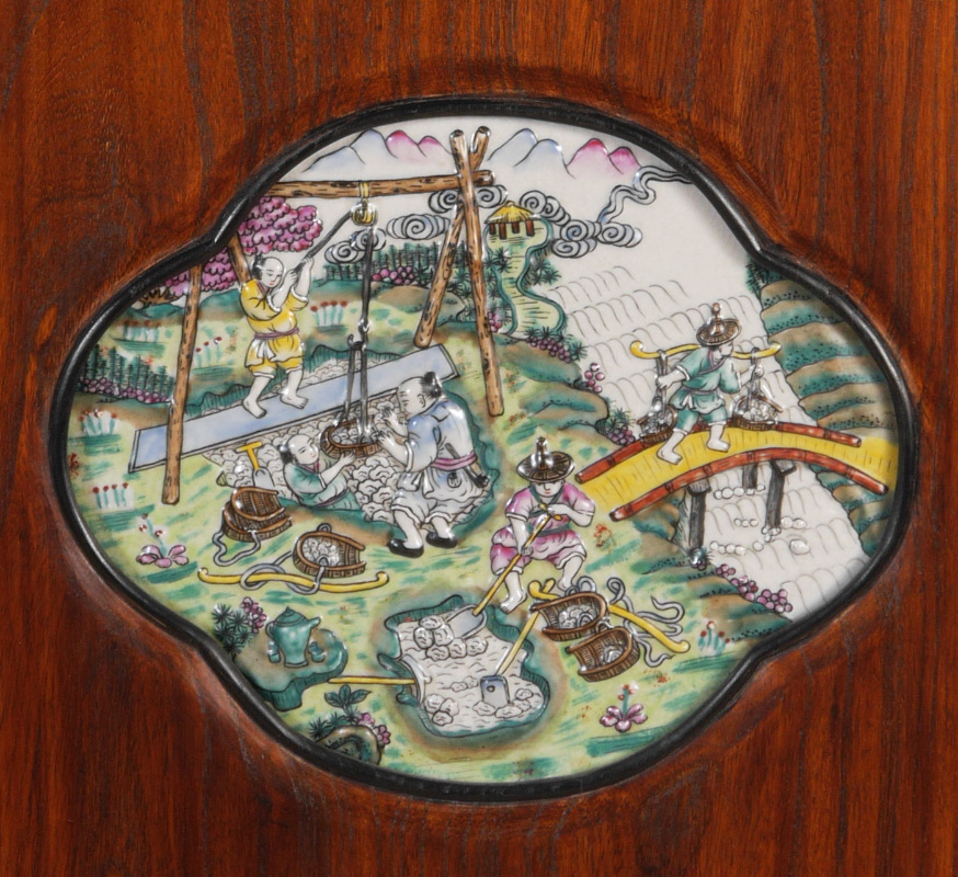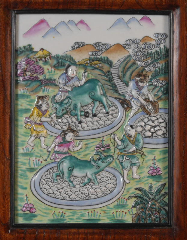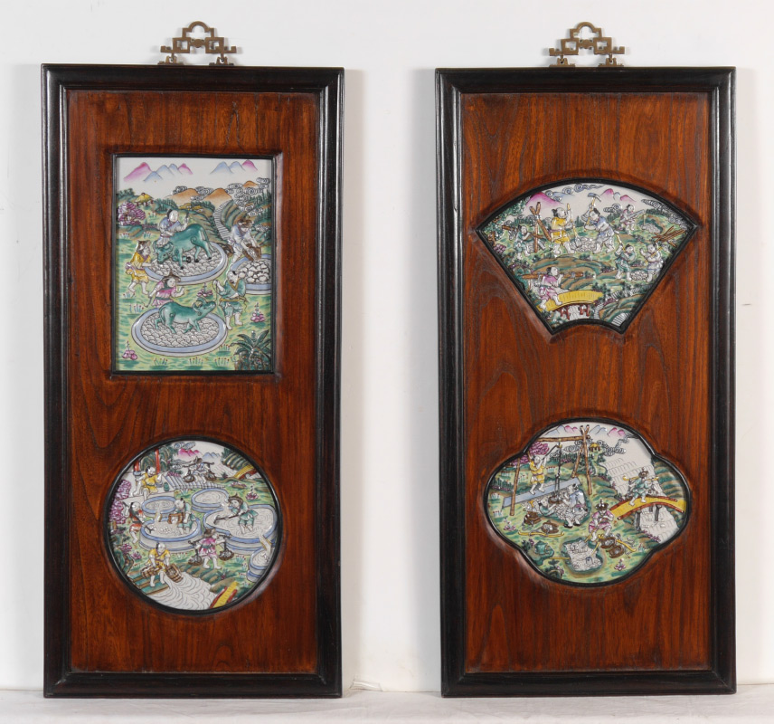 2 CHINESE POLYCHROME DECORATED CERAMIC PLAQUES: 2 framed plaques, each with 2 polychrome decorated panels of agrarian genre scenes. Each frame measures 29 1/2'' h. x 14''