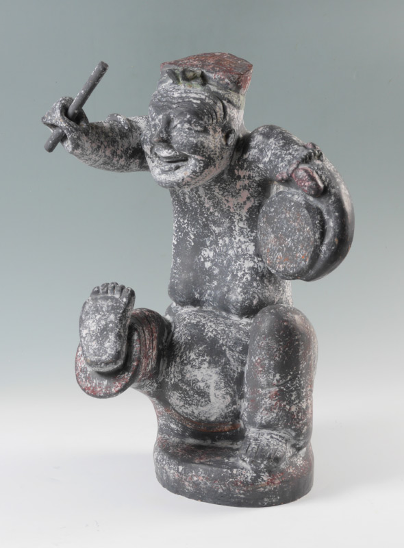 CHINESE FIGURAL MUSICIAN SCULPTURE: From the American Express ''China'' Collection, earthenware figure of a parade drummer, antiqued paint decorated finish, 22 3/4'' h. x 14'' x 12 1/2''. Sold with a chrome display pedestal with illuminated glass top, 30'' h. x 14'' x 14''.