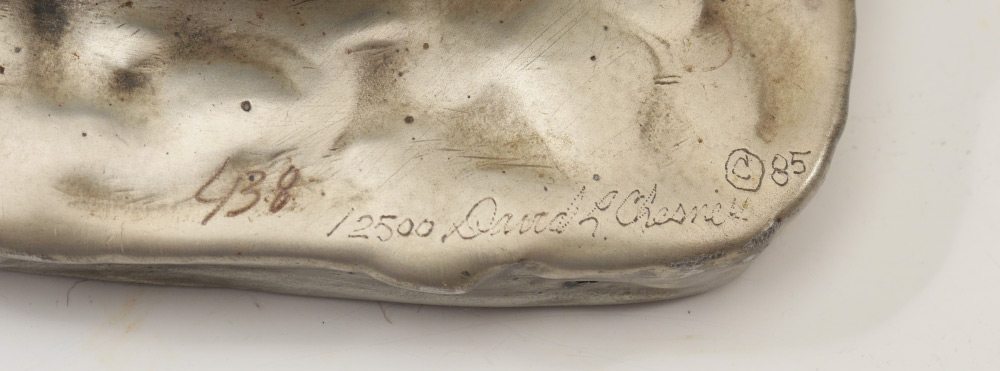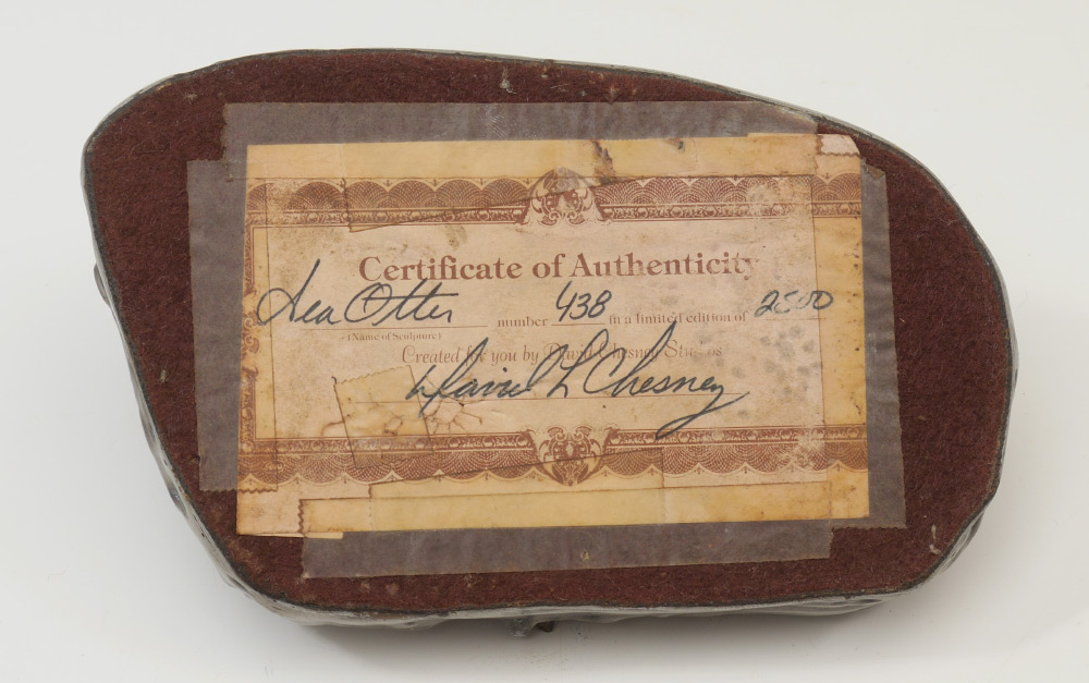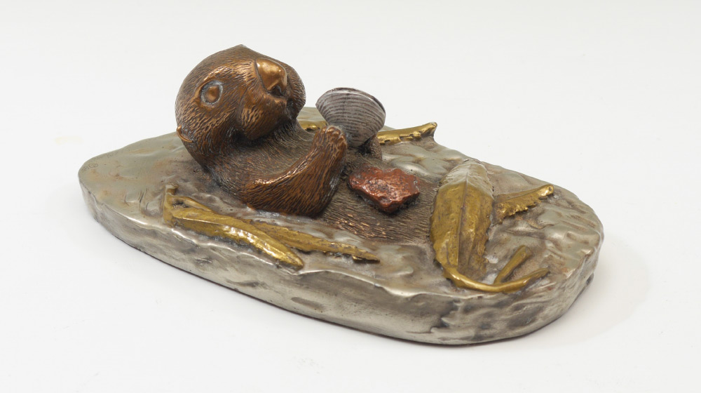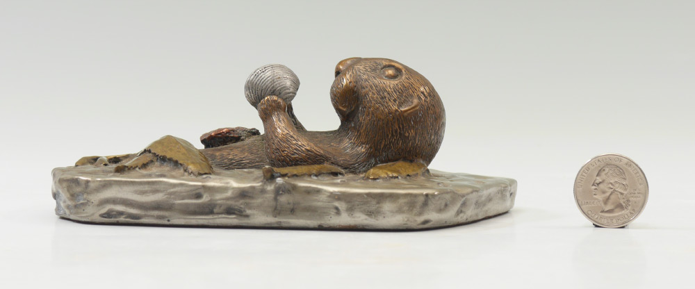 DAVID CHESNEY STUDIOS SEA OTTER SCULPTURE: Mixed metal sea otter floating on it's back with a clam. Signed with Certificate of Authenticity taped to base, #438/2500. 2 1/4'' h. x 6 1/4'' x 3 3/4''.