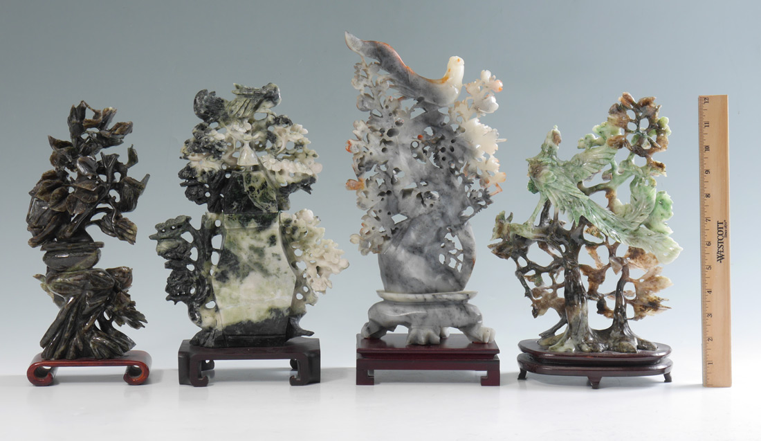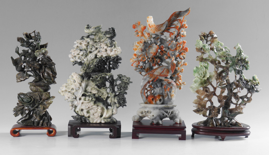 4 CHINESE CARVED STONE GROUPS: 4 pieces total to include 1) Birds on flowering branches, 13 1/4'' h. x 7'' x 3 1/4'', wood stand 1 1/4'' h. x 6 1/4'' x 4 1/2''. 2) Covered jar with 2 birds atop flowering branches, affixed to wood base, 12 3/4'' h. x 6'' x 5''. 3) Bird on branches, affixed to wood base, 12 1/4'' h. x 6 1/2'' x 4 1/4''. 4) Grasshoppers and bird on branches, affixed to wood base, 12'' h. x 5'' x 3''.