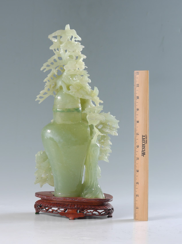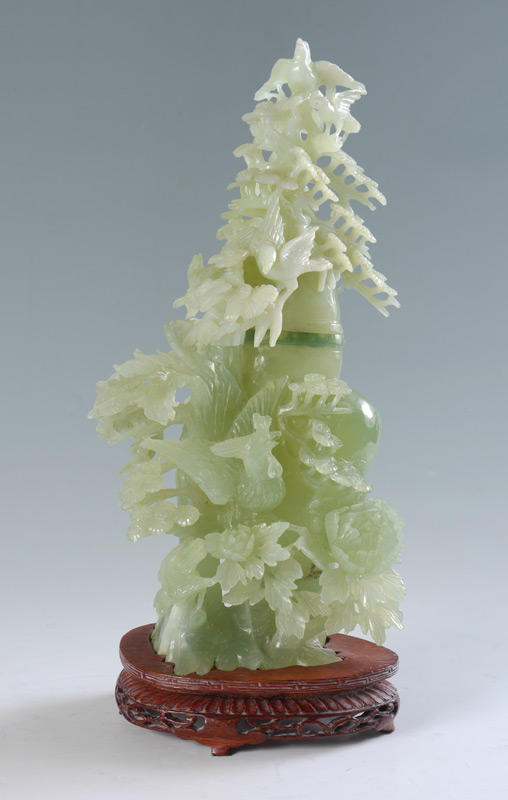 CHINESE CARVED SERPENTINE COVERED JAR: Carved serpentine or similar stone jar and lid with carved figural birds on branches and flower blossom motifs, affixed to carved wood base. 16'' h. x 7'' x 4''