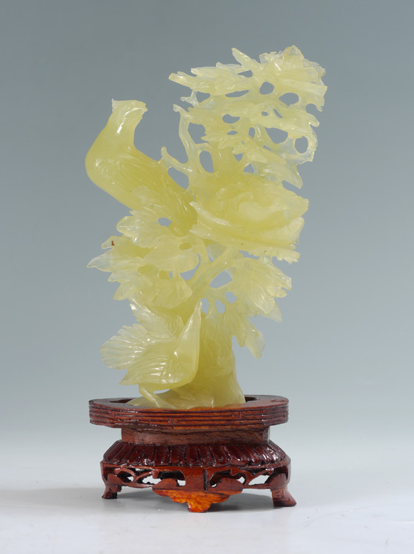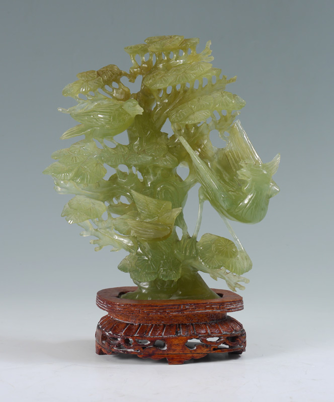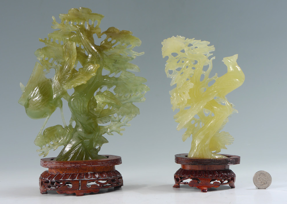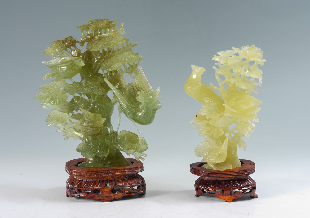 2 CHINESE CARVED SERPENTINE FIGURAL BIRDS: 2 pieces total carved serpentine or similar stone to include 1) 3 birds in flowering branches, affixed to wood base, 9 1/2'' h. x 7'' x 2 3/4''. 2) Single bird on flowering branch, 6 1/2'' h. x 4 3/4'' x 2'', wood base 1 3/4'' h. x 3 1/2'' x 2 1/4''.