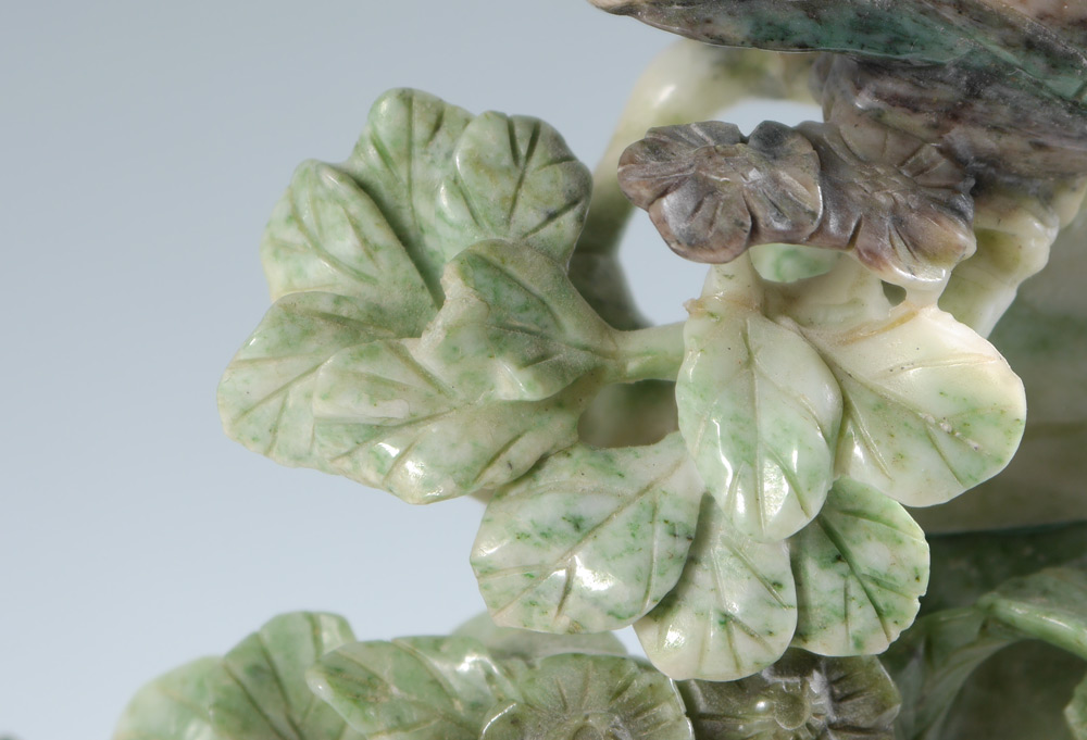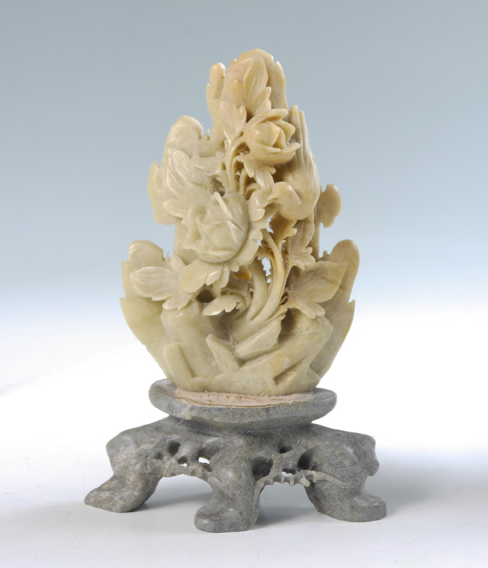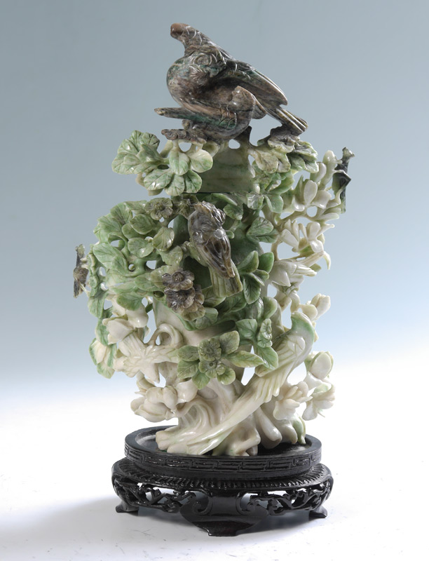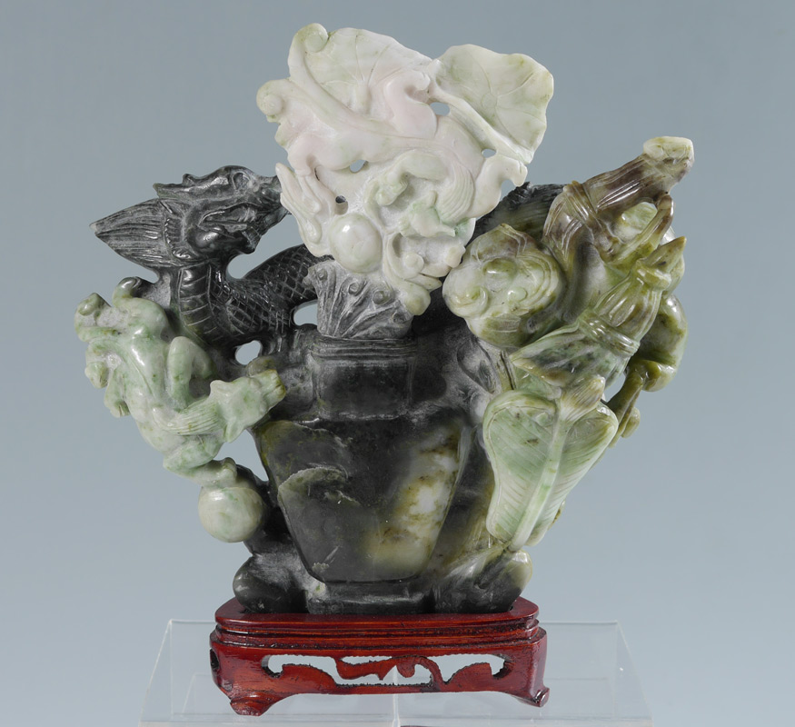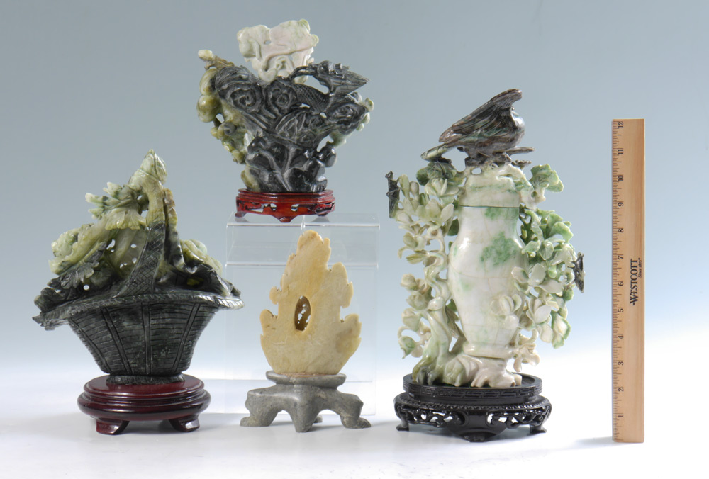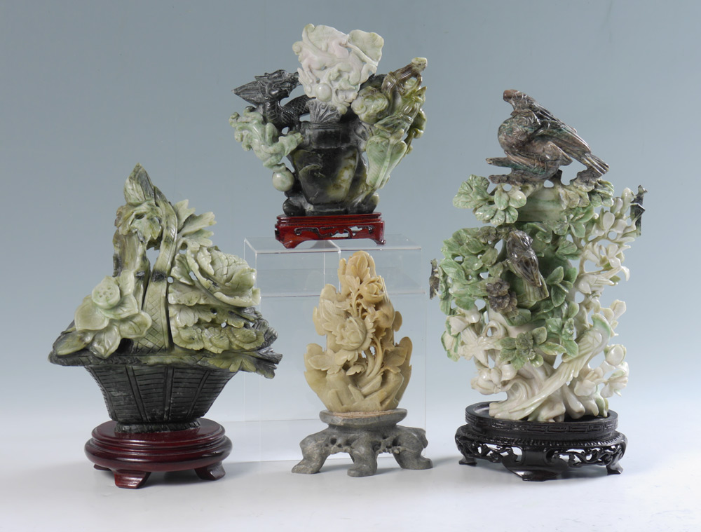 4 PIECE CHINESE CARVED STONE FLORAL GROUPS: 4 pieces total to include 1) Covered jar with birds, insects, and branches motif, affixed to wood base 13 1/2'' h. x 8'' x 4 1/2''. 2) Basket of flowers, affixed to wood base, 11'' h. x 8'' x 5''. 3) Urn and figural dragon with smoke, affixed to wood base, 8'' h. x 7 1/4'' x 3''. 4) Bouquet affixed to stone base, 8'' h. x 5'' x 2 1/4''.