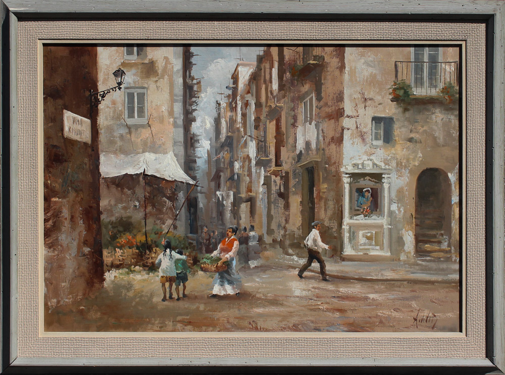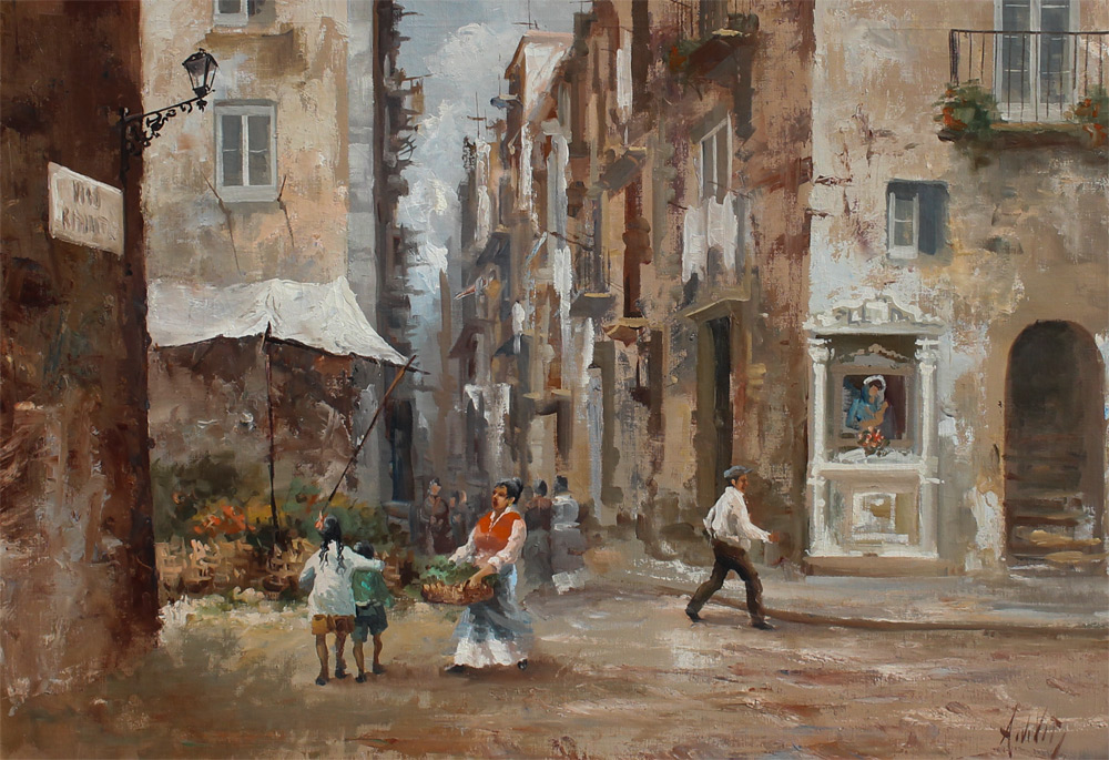 DEVITY, Antonio, (Italian, 1901-1993): Italian Street Scene with Flower Seller, Oil/Canvas, 27'' x 39'', signed lower right, framed, 34'' x 46.5''.