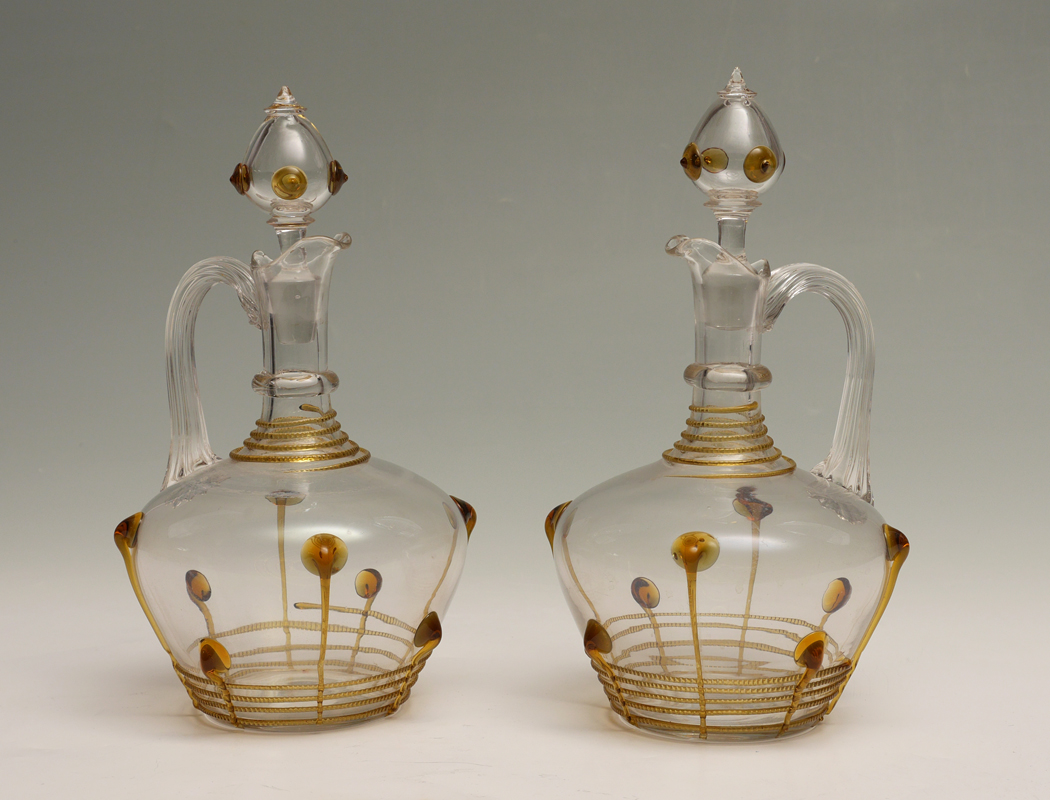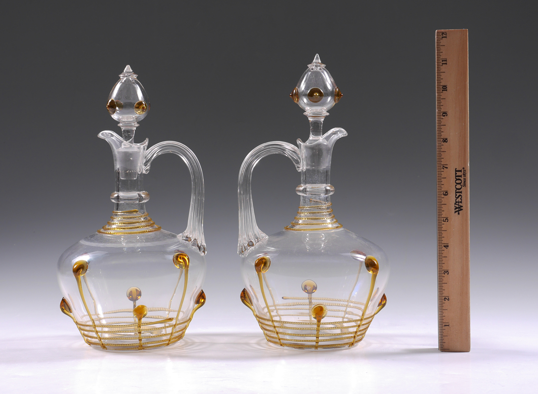 PAIR BOHEMIAN ART GLASS DECANTERS: Unmarked attributed Loetz or Kralik, clear glass with amber threaded glass decoration and applied spot and ''tadpoles''. Overall measures 11'' h. x 6''.